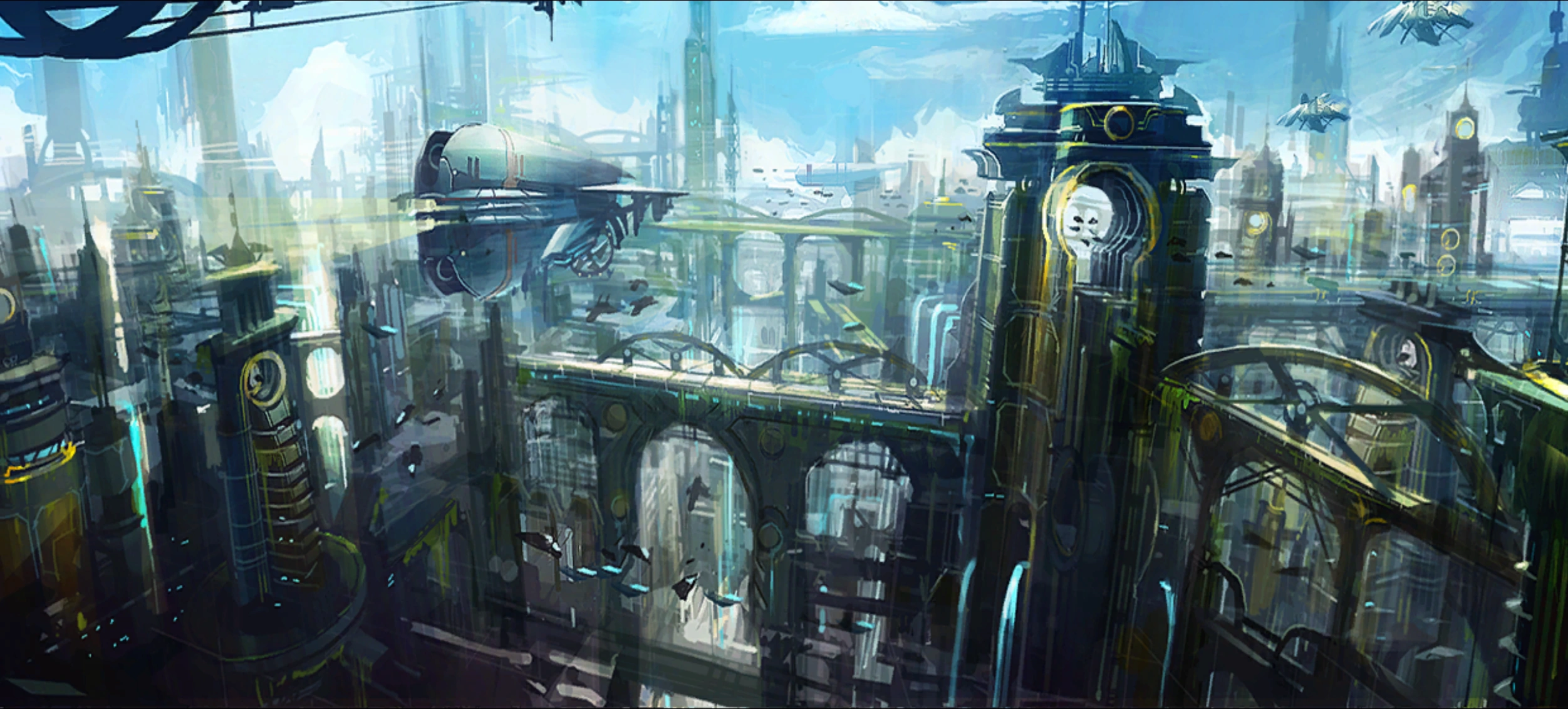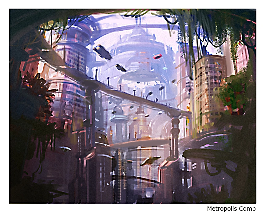 Metropolis is a sprawling cityscape of towering skyscrapers adorned with greenery, intersected by busy skyways. The buildings rise so high that their bases vanish into a dense blanket of fog, and are topped slender spires. Sky bridges, elevated platforms, and open spaces allow for pedestrian movement between structures.