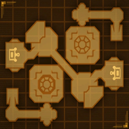 Jump pads from each base lead to elevated rooftops with nodes that, when captured, provide weapons such as the Morph-o-Ray, Lava Gun, and a hovership. Other pads lead to pyramid-like structures with nodes on top. To one side of each base, versa-targets connect to a corner rooftop containing a node with a Minirocket Tube and Flux Rifle, and onward to a tower with drone bots, nanotech, and a vantage point over an opposing node.