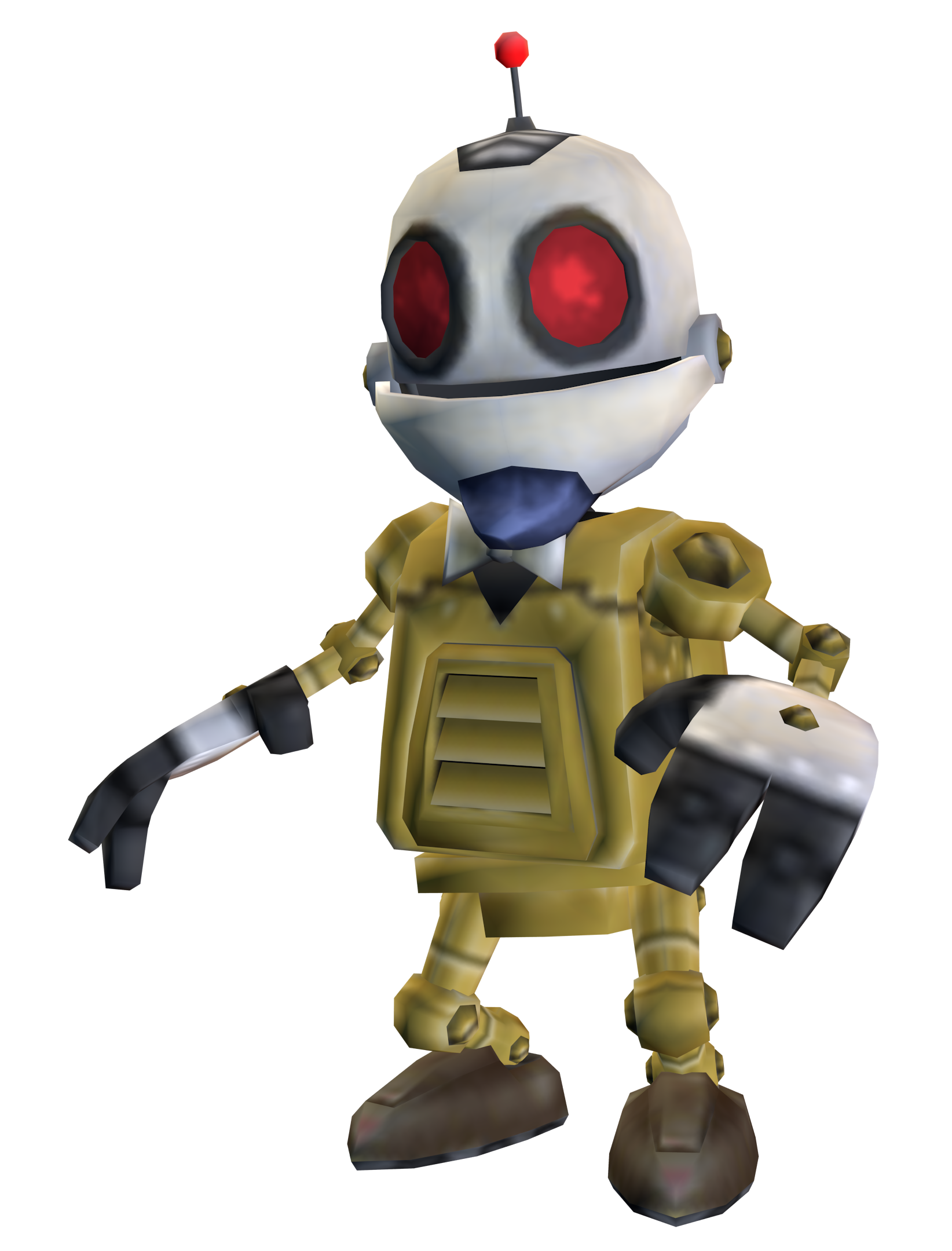 Klunk was created on planet Mariana to spy on the Q-Force by impersonating Clank. He impersonated Clank after Nefarious and Courtney Gears abducted Clank at Holostar Studios. Klunk appeared to be identical to Clank in capabilities, able to use the Heli-Pack and Thruster-Pack, and transform into an Ultra-Mech form. He had normally red eyes, which he could switch to green to fool others including Ratchet. Years later, after Nefarious was defeated, Klunk was the mastermind behind the theft of the Eye of Infinity, though he was defeated by Clank.
