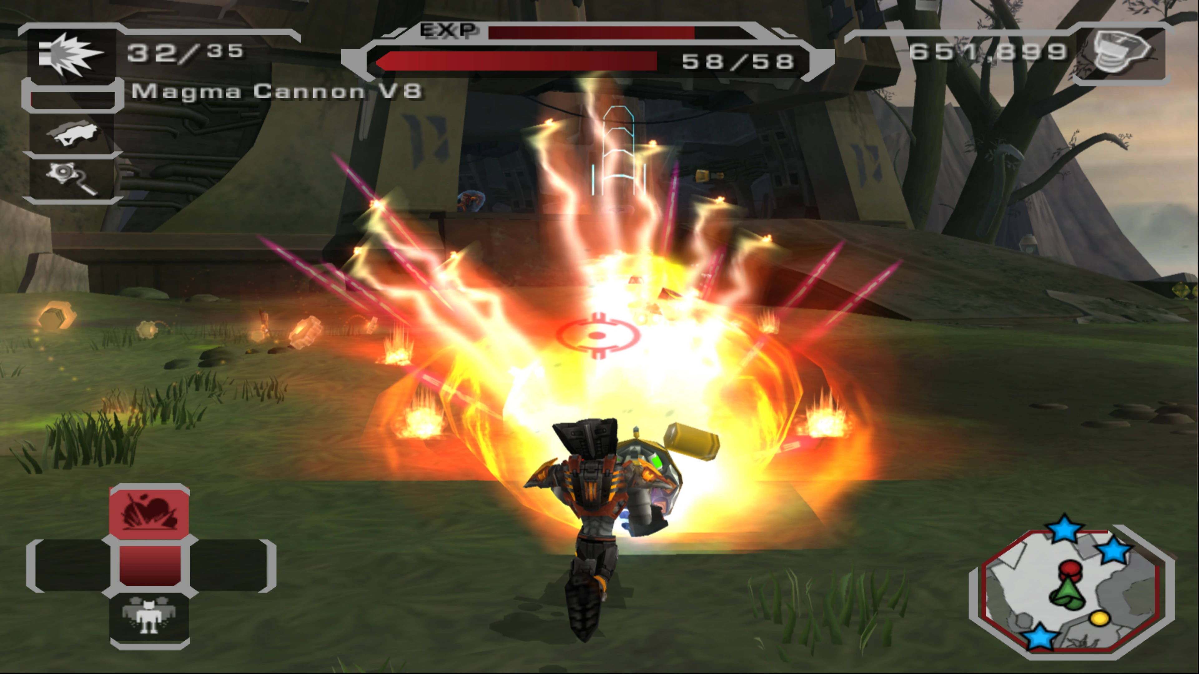 The Magma Cannon benefits from a few of the common alpha mods and upgrading the weapon grants a fair balance of Speed, Ammo, and Impact Mods. Once upgraded to the Vulcan Cannon, its automatically homing energy rays are even more effective in applying any mods' effects onto enemies in front of you en masse. Due to the lack of damage compared to other weapons, it is generally more effective to use the weapon for crowd control, such as by using a few Impact Mods to keep enemies down, and the Freeze Mod to slow and freeze as many as possible.