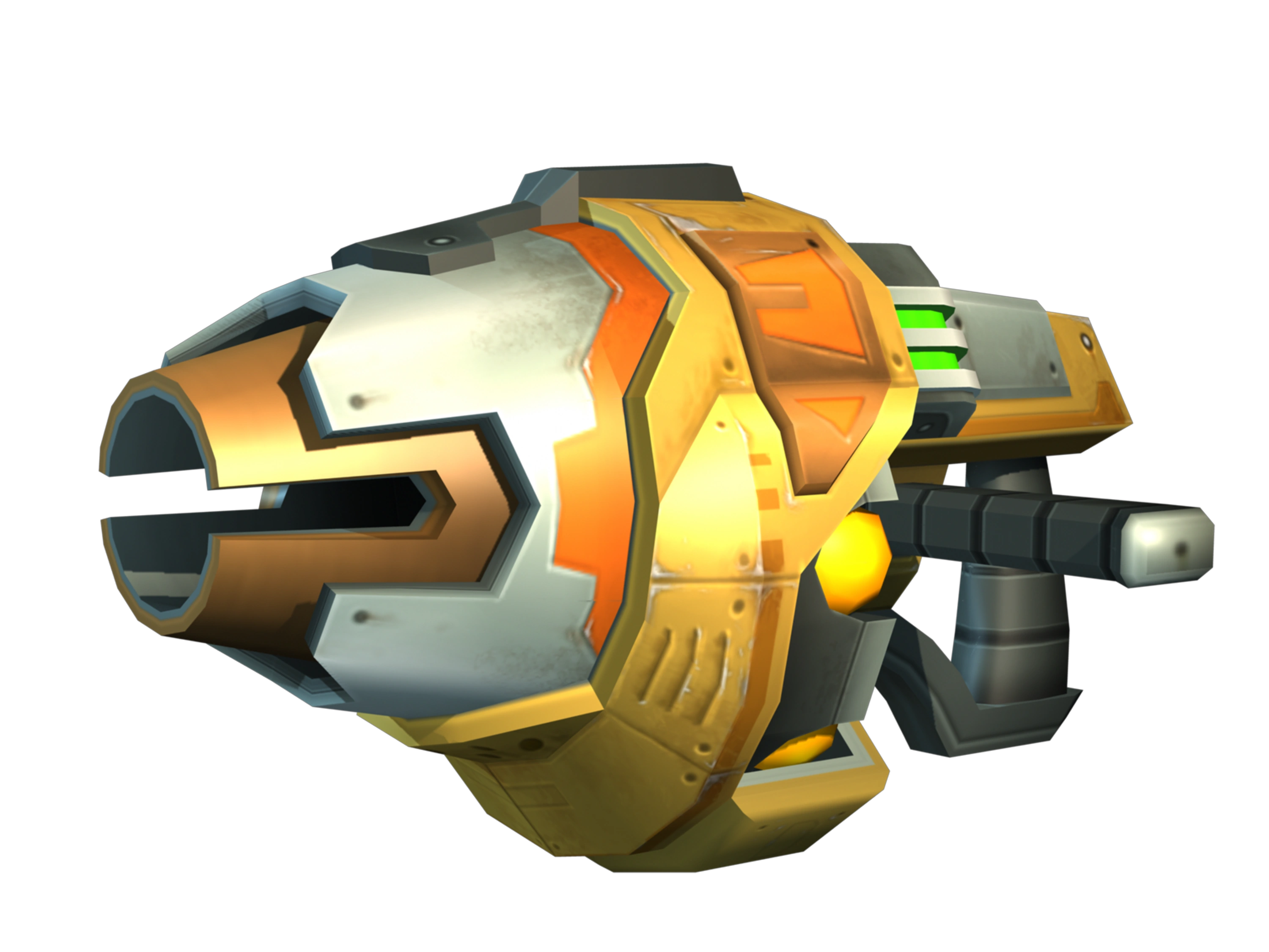 The Magma Cannon is a short, yellow weapon with a bulky, wide barrel but a small nozzle and a left-hand grip. It fires a blast of magma energy over a wide radius. The Vulcan Cannon has a much longer barrel with a wider nozzle, and fires seeking lasers instead.