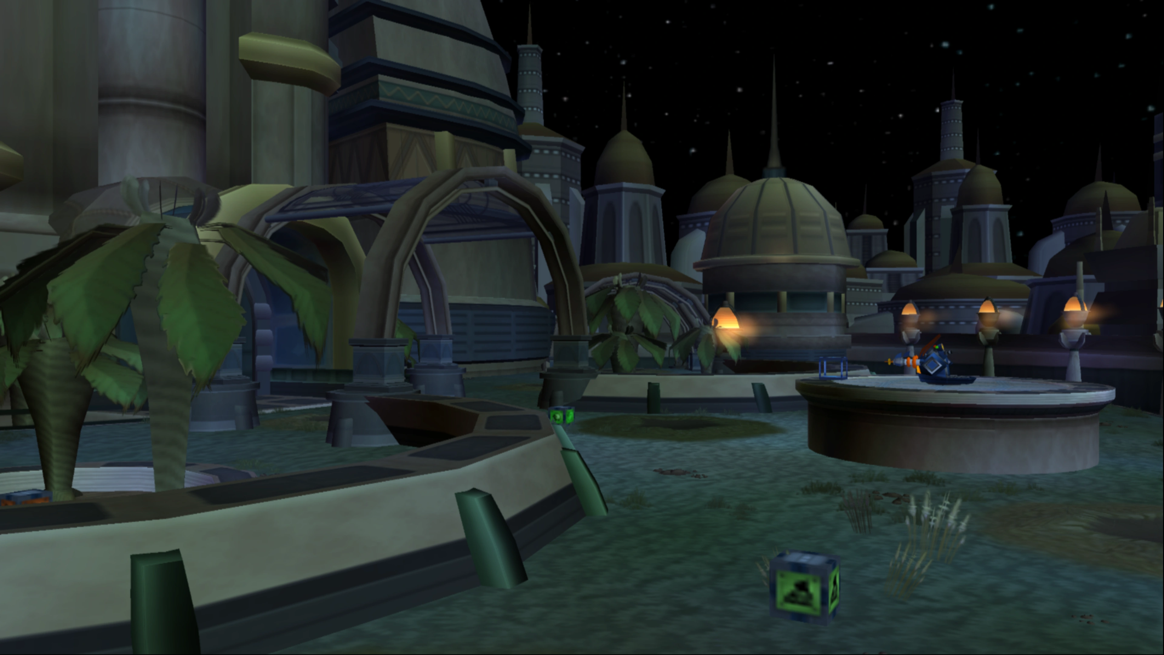 Capital City is a grand metropolis with regal, orange structures built over prominent canals. The city is characterized by numerous skyscrapers, many topped with gilded domes, while smaller buildings feature rooftop gardens with palm trees. During Ratchet's visit, the city showed signs of battle, with blast marks and rubble visible.