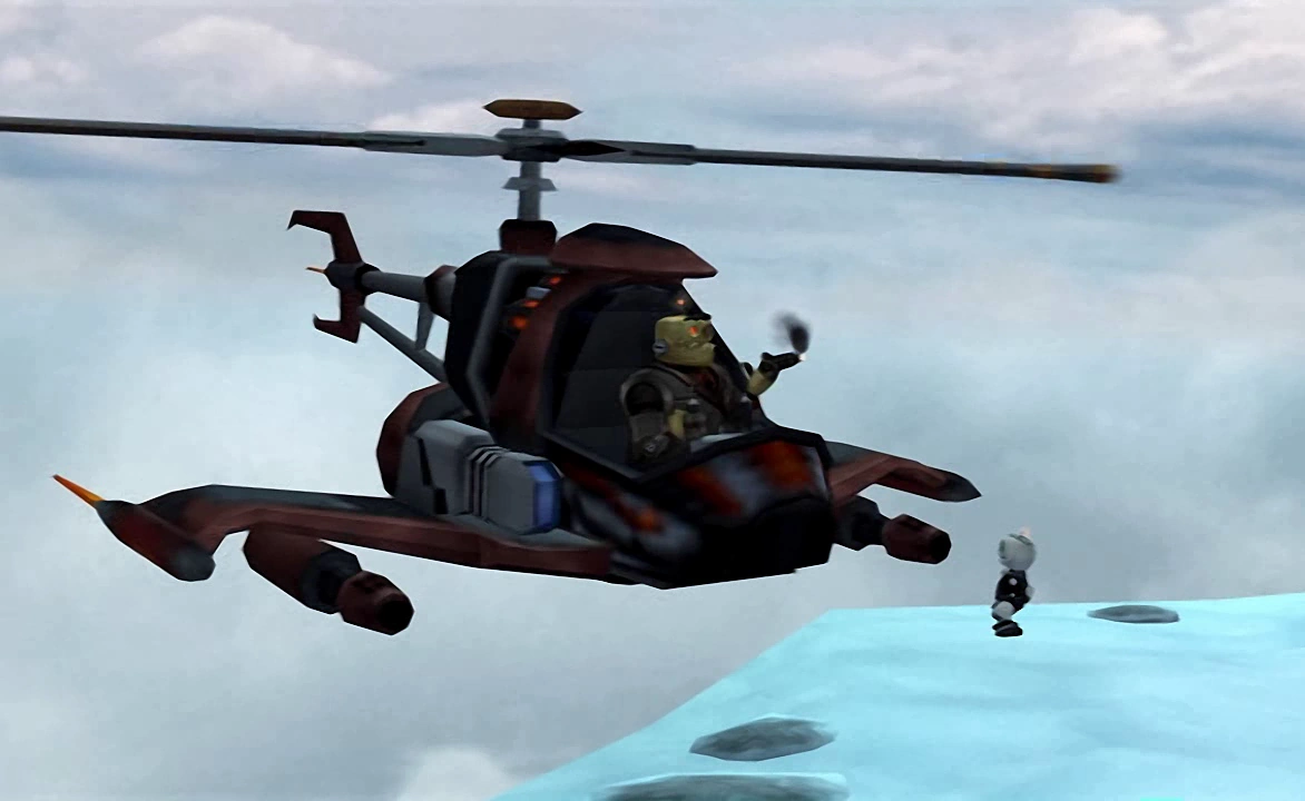 Maxmillian then appeared in the Secret Agent Clank movie, premiering following the defeat of Dr. Nefarious. In it, Maxmillian's ninjas chased Clank through snow on an ice planet, before Maxmillian appeared in an Attack-Copter. Clank used the BGAMD to fire a banana at Maxmillian, leading Skrunch to chase the banana and attack Maxmillian's Attack-Copter, causing it to crash.
