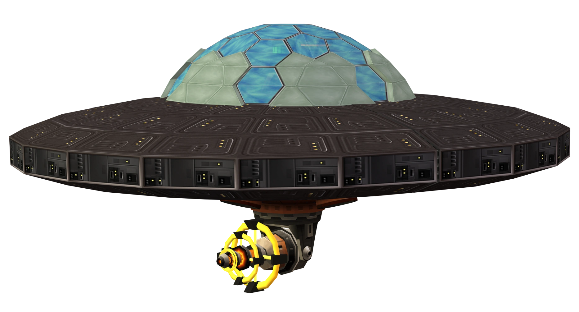 The mothership is an optional boss in Going Commando, fought on the moon orbiting Damosel by Giant Clank during "Defeat the mothership". It is a large flying saucer, with grey coloration and a glass dome on-top, that released robot minions to attack the city.[1] After it was defeated by Clank, it dropped the Mapper.