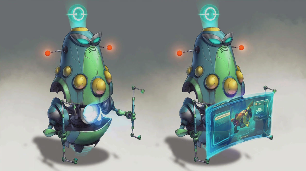 Ms. Zurkon and her counterpart serve as the vendors for Rift Apart, providing Ratchet and Rivet with weapons, ammunition, and raritanium upgrade services. Part of the Zurkon family business, Ms. Zurkon sells weapons as a side hustle to fund Zurkon Jr.'s college education, but also collaborates with the Resistance to topple Emperor Nefarious.