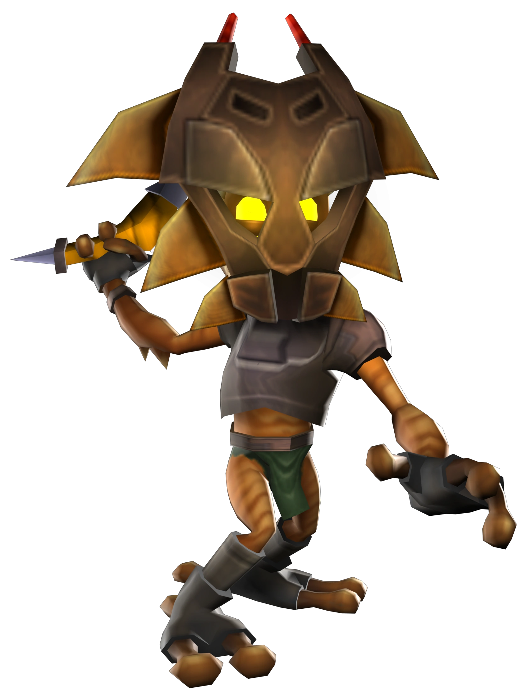 Nabla natives have orange skin and a humanoid appearance, and are taller than Ratchet. They have glowing yellow eyes, visible beneath their large, wooden masks in battle they were in battle. After sustaining damage, their masks will fall off, revealing their simian faces beneath.