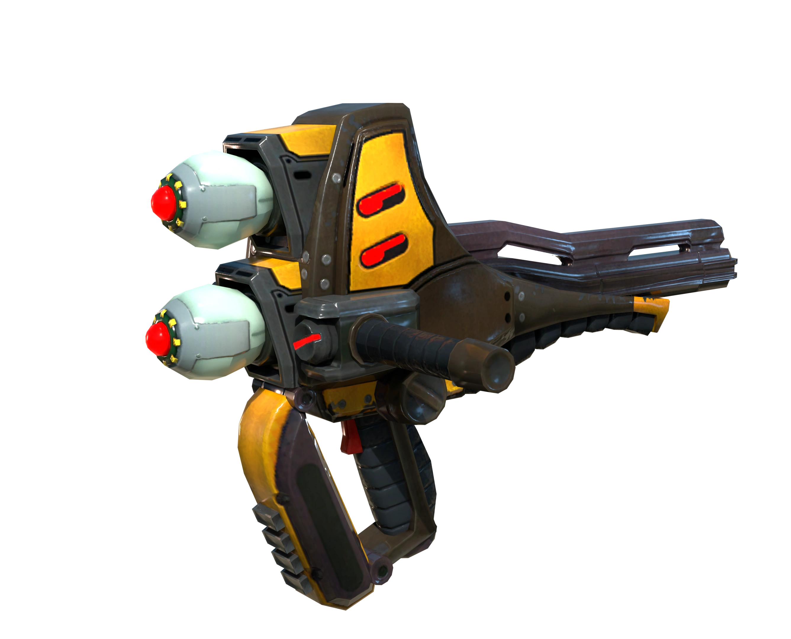 The Negotiator is a shoulder-mounted yellow and grey rocket launcher with red highlights. It features two rockets at the end from which it fires, and one left-hand grip. The rockets it fired would fly towards enemies in a spiraling motion.