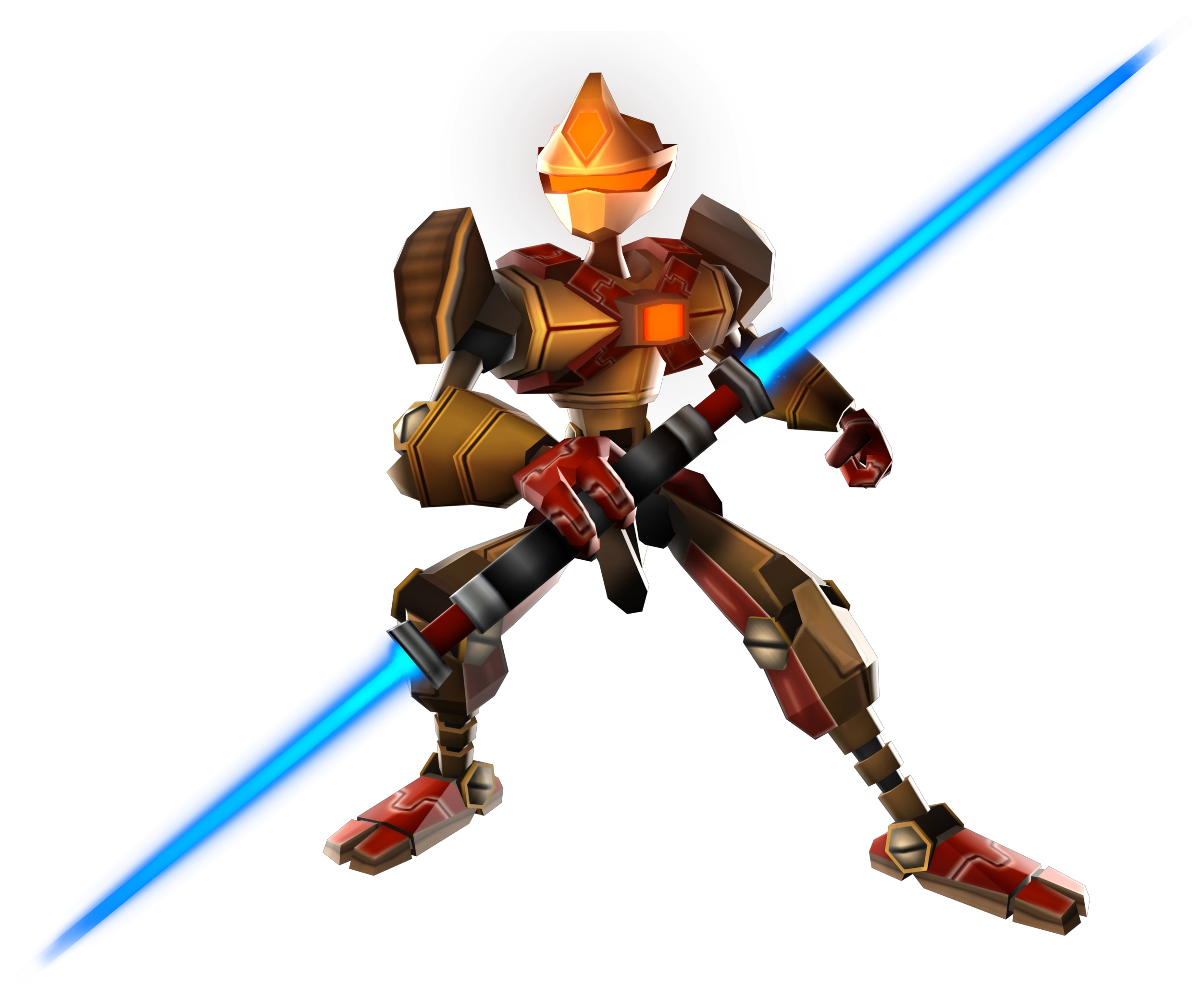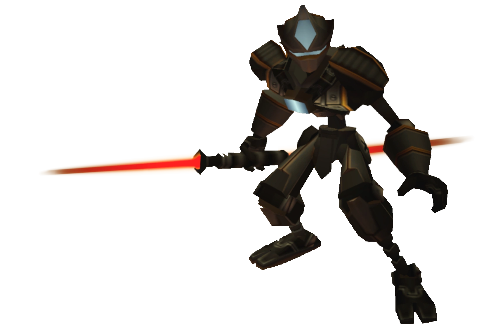 Ninja bots are humanoid, brown-tinted robots with a glowing visor and light on their forehead, and chest. Two variants exist, a dark brown type seen only in the Annihilation Nation arena, and a light brown type used by Nefarious and the gauntlet challenges, the former has a blue light and visor, and the latter red. They are notably acrobatic, and during combat, using multiple forward handsprings to quickly close the distance to their target, performing backflips after an attack, and spinning from their double-bladed laser swords to move around or kick. They can also spin their laser swords to intimidate an opponent.