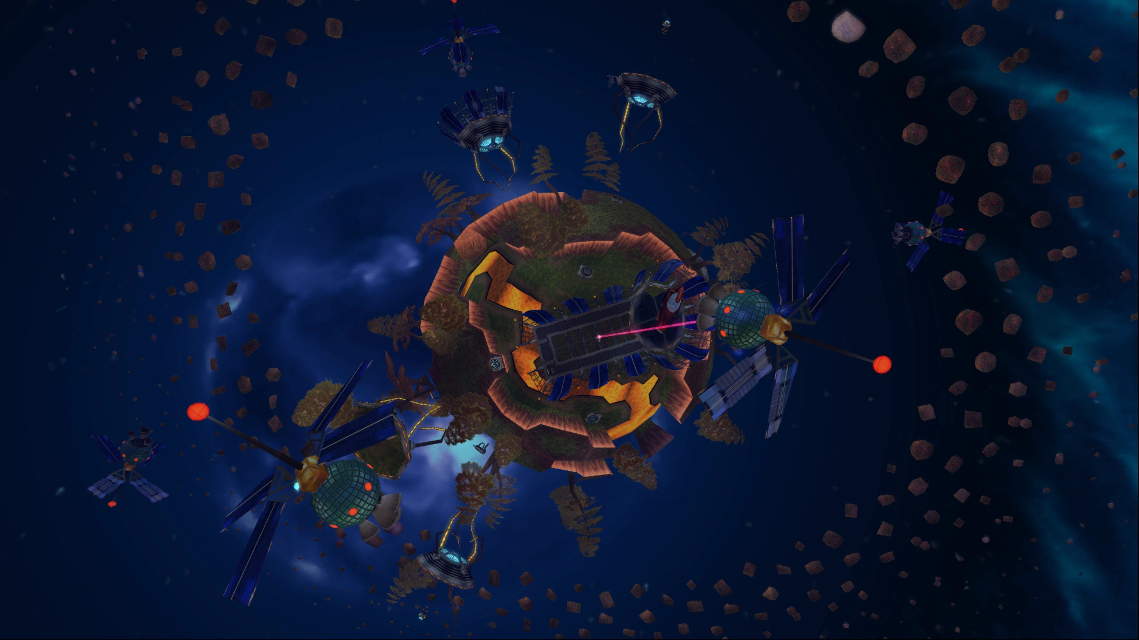 Surrounding the moon is a larger ring of small asteroids, as well as a series of satellites connected by lasers. These laser beams link from the landing pad at the start to the teleporter at the end.