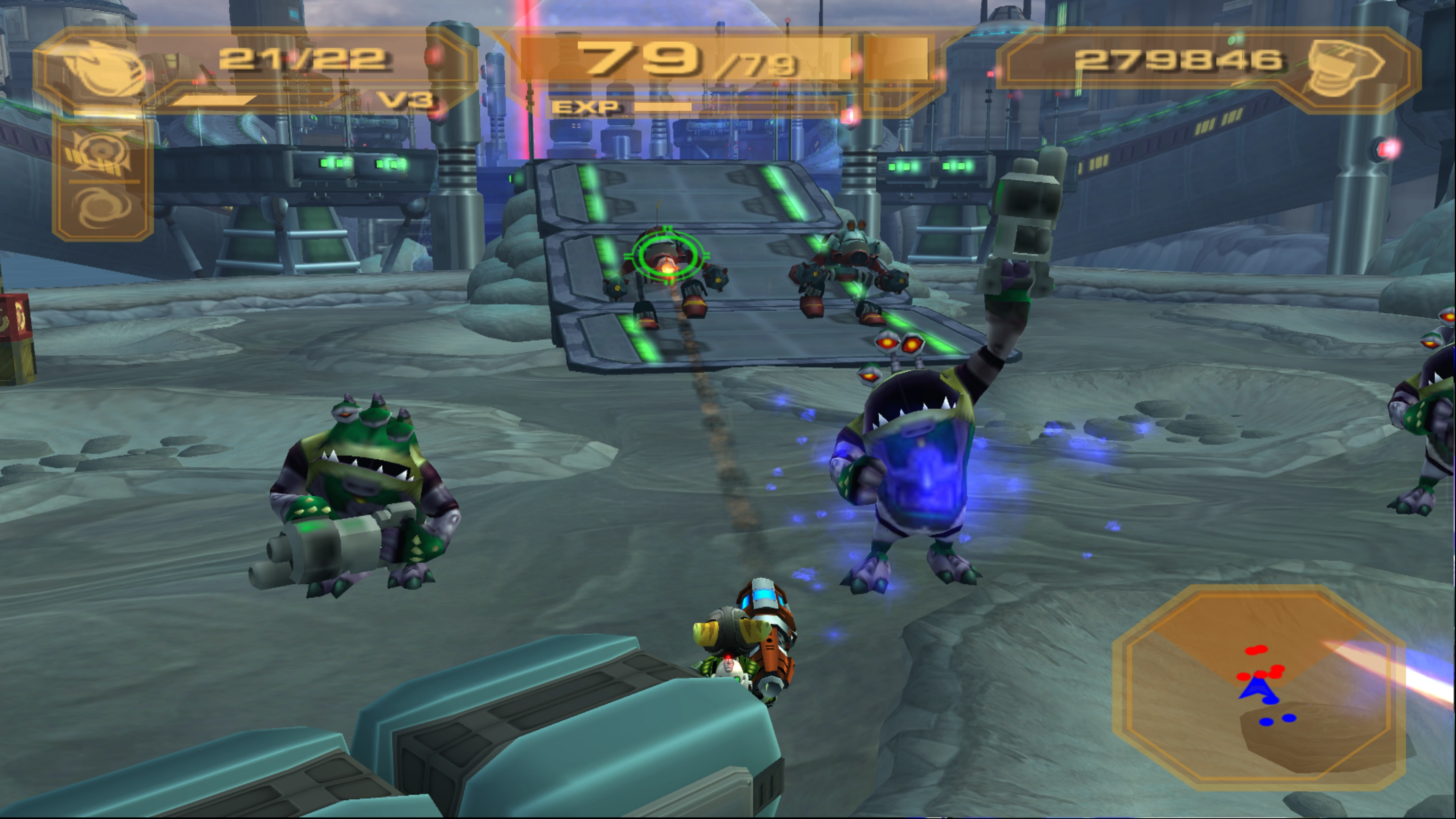 As the first wave of enemies are defeated, tyhrranoid dropships will deploy several more. Unlike previous missions, if you possess the Annihilator, Flux Rifle, or Disc Blade Gun, you have the firepower to destroy them before they even drop any. Destroy them and the enemies that come, and a group of tyhrranoid saucers deploying one-eyed tyhrranoids will attack. Tyhrranoid saucers are weaker than three-eyed tyhrranoids or mechs, meaning it is best to preserve ammo for weapons such as the Annihilator, and instead use smaller weapons or simply the Miniturret Glove to deal with them. The one-eyed tyhrranoids can be dispatched using the usual Lava Gun, Plasma Whip, or simply sucked in as Suck Cannon ammo. After this, one final wave of mechs and three-eyed tyhrranoids will come across the bridge; deal with them the same way as before.