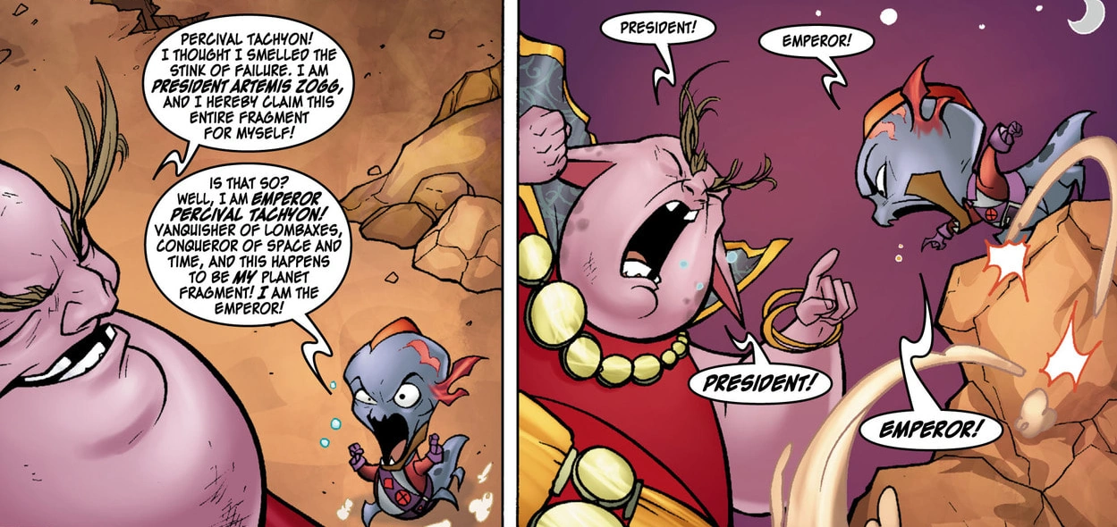 Emperor Tachyon on Reepor taking the Dimensionator from Qwark.