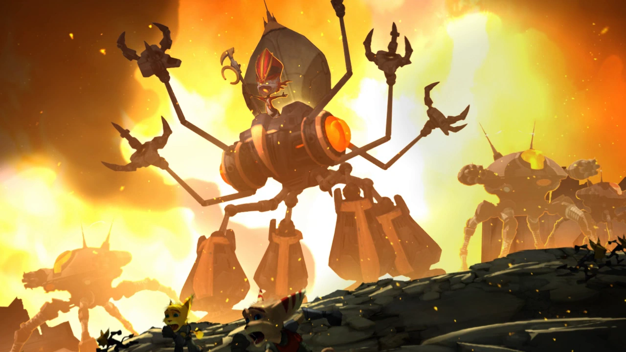 After Ratchet and Clank repelled the invasion, Tachyon returned to Fastoon, where he planned on releasing all of the remaining cragmites to colonize the lombax homeworld. Ratchet and Clank, along with their allies Talwyn Apogee, Cronk, and Zephyr, fought through Tachyon's armies to stop him. After a long battle, Tachyon told them to meet him in the Court of Azimuth.[28]