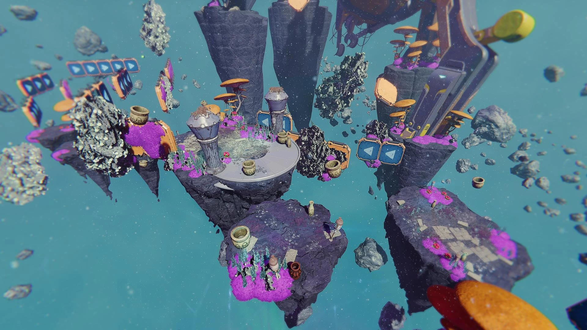 Here, invisible platforms with crates and robomutts on them mark the path forward. The platforms are made briefly visible by hitting the switches on the floating islands on the way. Outside of this, while it is possible to throw Rivet's hammer on the ground to work out where the solid surfaces are, another viable option is to simply aim to jump and Phantom Dash towards the crates and use them as the surface. At the end, the Ranger tactical vest is acquired and the platforms become permanently visible to return to the entrance and exit.