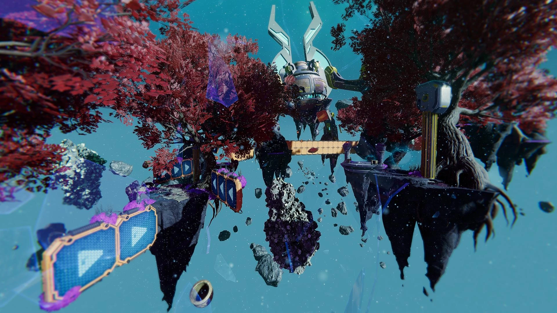 This is an optional pocket dimension located at the refueling depot of Zurkie's before entering the gastropub. From your ship, explore the landing pads to your right in order to locate the rift. The pocket dimension mostly involves traversal across several floating islands with platforms between them. The malfuntioning platforms will shift sideways every four seconds with an audio cue just before it happens. With good timing and platforming, the course can be traversed quickly. When the platforms turn on their side, it is also possible to stand on the narrow, upturned edges. At the end, an armor pod containing the Q-Force cowl is obtained, and a Rift Tether leads back to the entrance.