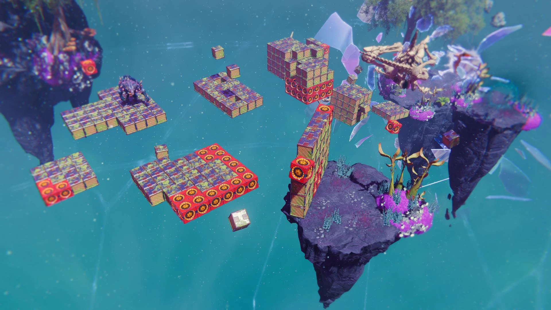The key is to use well-aimed shots from the Burst Pistol to carve out a traversible path for Rivet to jump between. You need to break just enough crates to walk on safely, but not too many that the path is entirely destroyed. hoverboots and Phantom Dashes are not recommended here as they will instantly break any crate touched while using them. At the end of the path an armor pod containing the robot disguise chest is found and a Rift Tether leading back to the entrance.