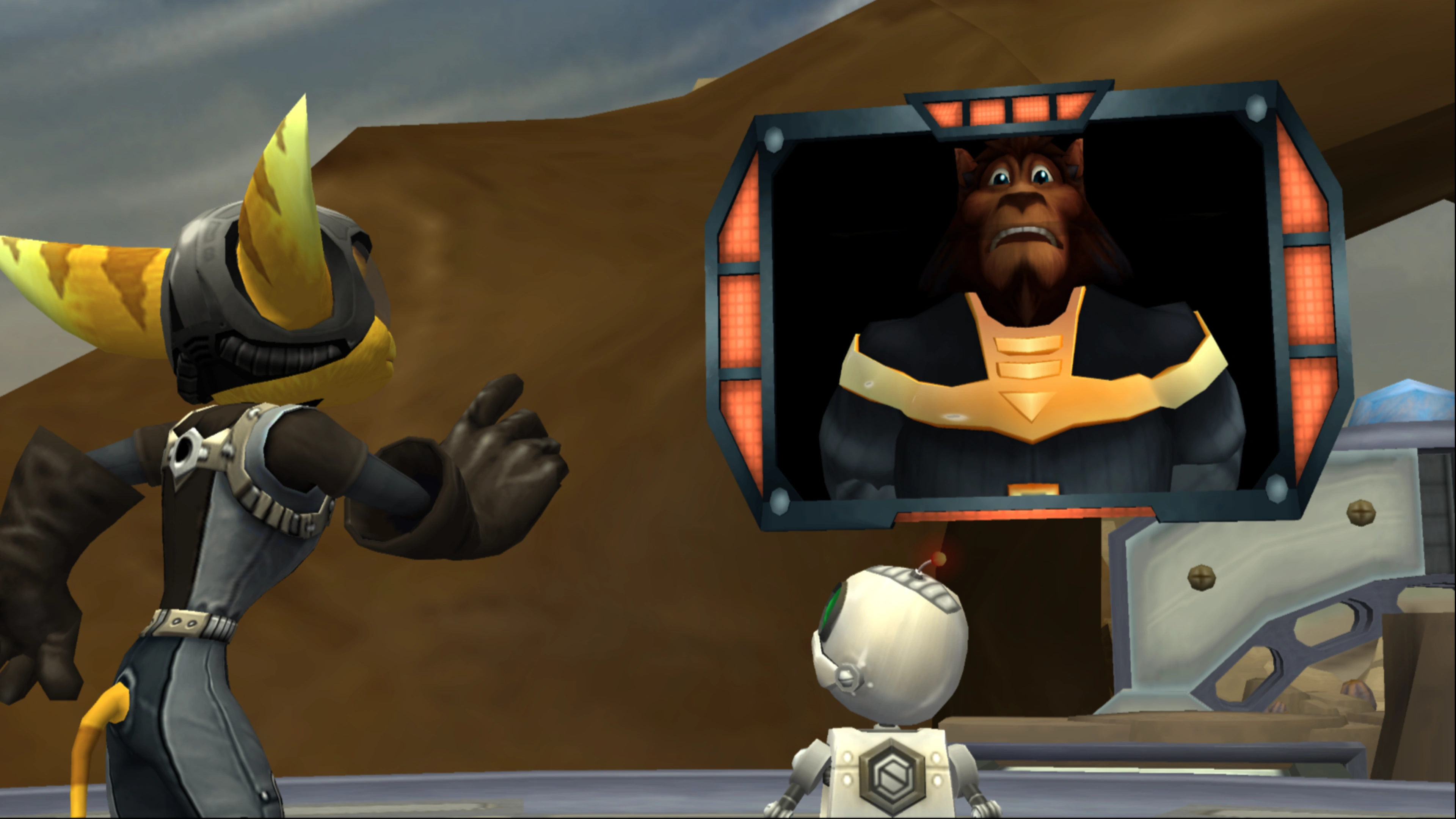 President Phyronix instructing Ratchet and Clank to find Captain Qwark.