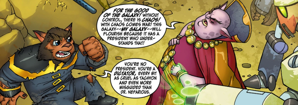 Phyronix was re-elected after the Nefarious war. He remained relatively quiet after the war with Nefarious was over, though he was mentioned in a few other titles. Vox News alleged that he had been involved with an amoeboid mafia scandal and installed his daughter as mayor of Metropolis to cover it up.[12] Vox News also claimed that Ratchet had voted against the president, causing a rift between him and Sasha,[13] and also that the president had been trying to set Sasha up with Captain Starshield.[12]