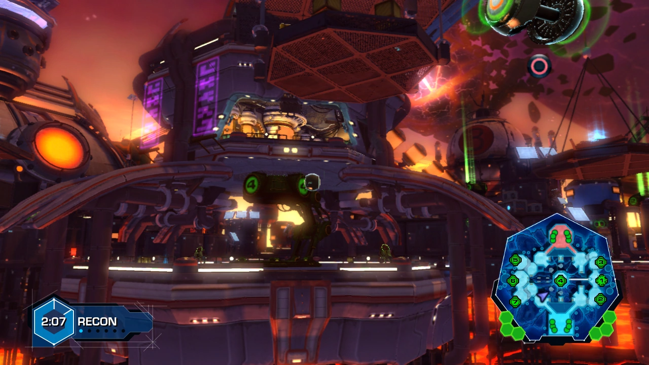 The map's main hub is the large central structure, which houses node 4 inside. Node 1 is only accessible via a single grind rail tube on the central structure's rooftop, which itself is reached by a set of hoverboots ramps near node 6. Alternatively, the roof can be accessed from within the structure by using jump pads to reach a series of surrounding platforms, which lead to more jump pads.