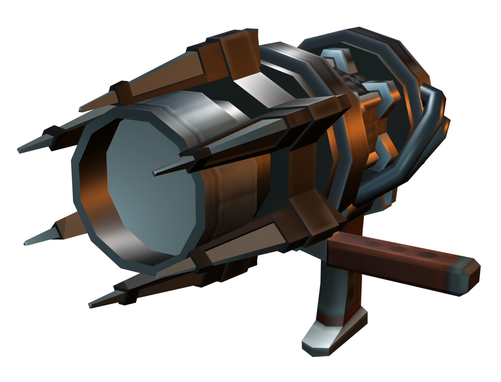 The RY3NO is a brown weapon with a large and thick barrel. It contains six protruding spikes surrounding its main nozzle, and has a left-hand grip. The RYNOCIRATOR appears very similar, though both the barrel, stock, and the spikes have gained an extra layer of armor, and the nozzle is smaller as well.