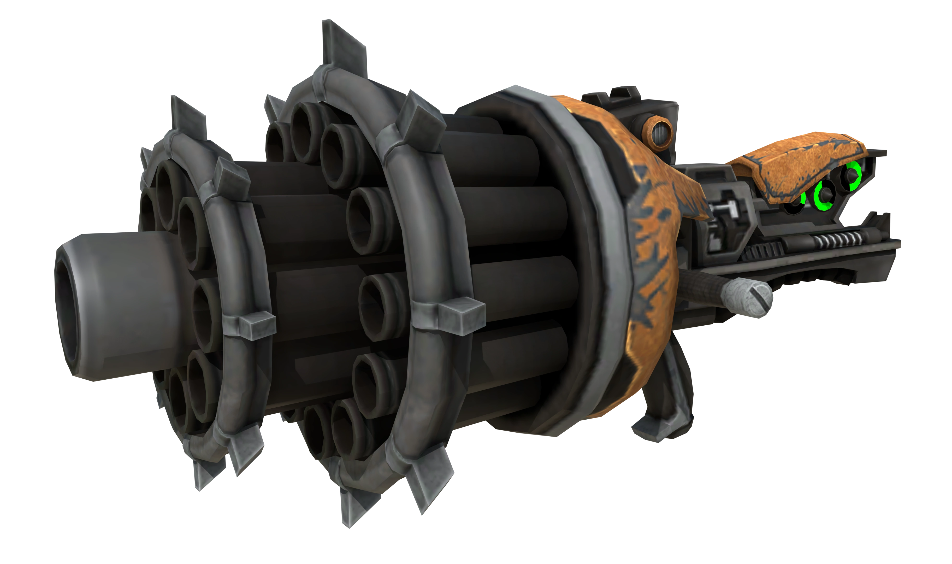 The RYNO V has 1,500 rounds of ammo at V1 (up to 3,000 at VX), though it consumes ammo at an incredible rate due to its rapid fire. Ammo conservation is not a significant concern, however, as ammo crates typically contain enough to quickly replenish the RYNO's capacity. The weapon's primary drawback is its high bullet spread, which often causes it to miss even medium-sized enemies. Despite this, its rapid fire and the power of its individual rounds make it capable of easily destroying most enemies on screen. It is most effective against large groups and the biggest and strongest targets, including bosses, which can be defeated in seconds at point-blank range.