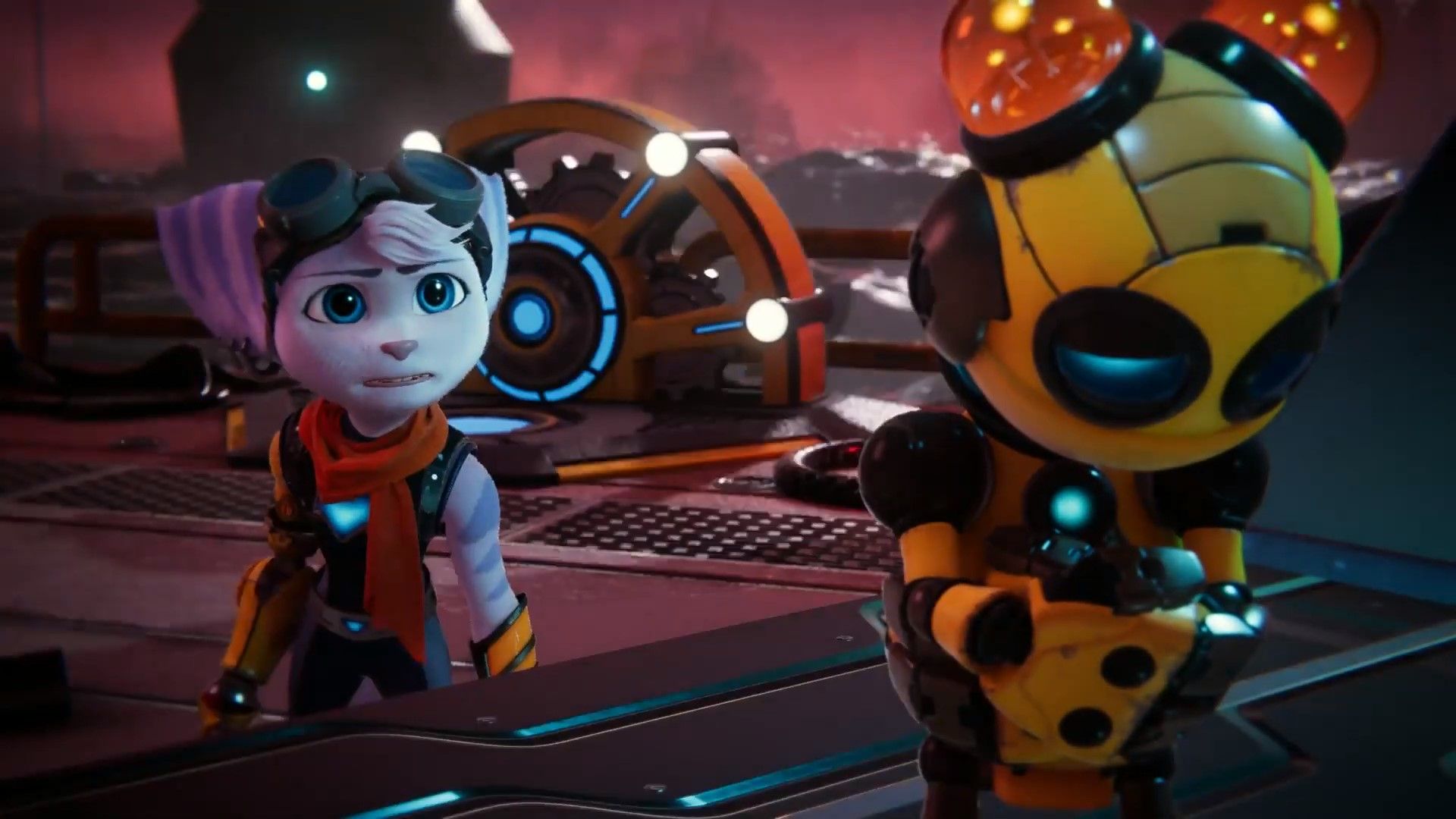 In Ratchet and Clank's dimension, the Festival of Heroes in Megalopolis is interrupted by Goons-4-Less seeking their bounty. Clank reveals his rebuilt Dimensionator to Ratchet, intending for him to find the other Lombaxes. Dr. Nefarious steals the Dimensionator. During the chase, Ratchet shoots the device's Phase Quartz power core, causing mass dimensional chaos. Ratchet uses the chipped quartz to create a Rift Tether. He and Clank defeat Nefarious, who then uses the damaged Dimensionator to transport them all to a dimension where he always wins. They arrive in a neon city; the device explodes. Clank's arm is damaged, and he is taken by Rivet, who mistakes him for an enemy robot. Dr. Nefarious awakens and is mistaken for his tyrannical counterpart, Emperor Nefarious.