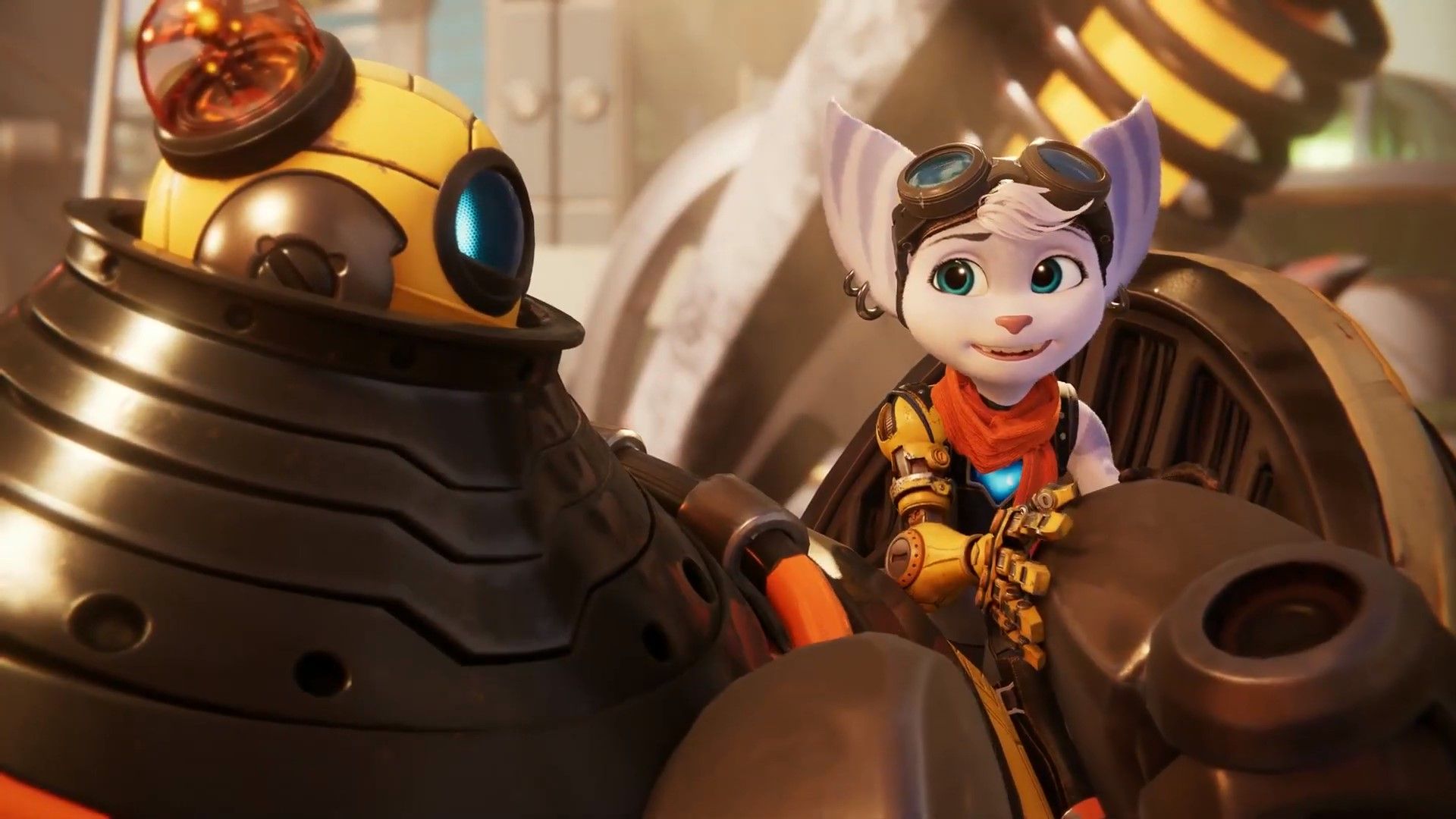 Ratchet, Clank, Rivet, and Kit are celebrated in Megalopolis. At Zurkie's, Clank receives a new yellow replacement arm, matching Rivet's. A news report shows Rivet and Kit (in Warbot form) pulling down a giant statue of the Emperor in Nefarious City, marking its liberation.