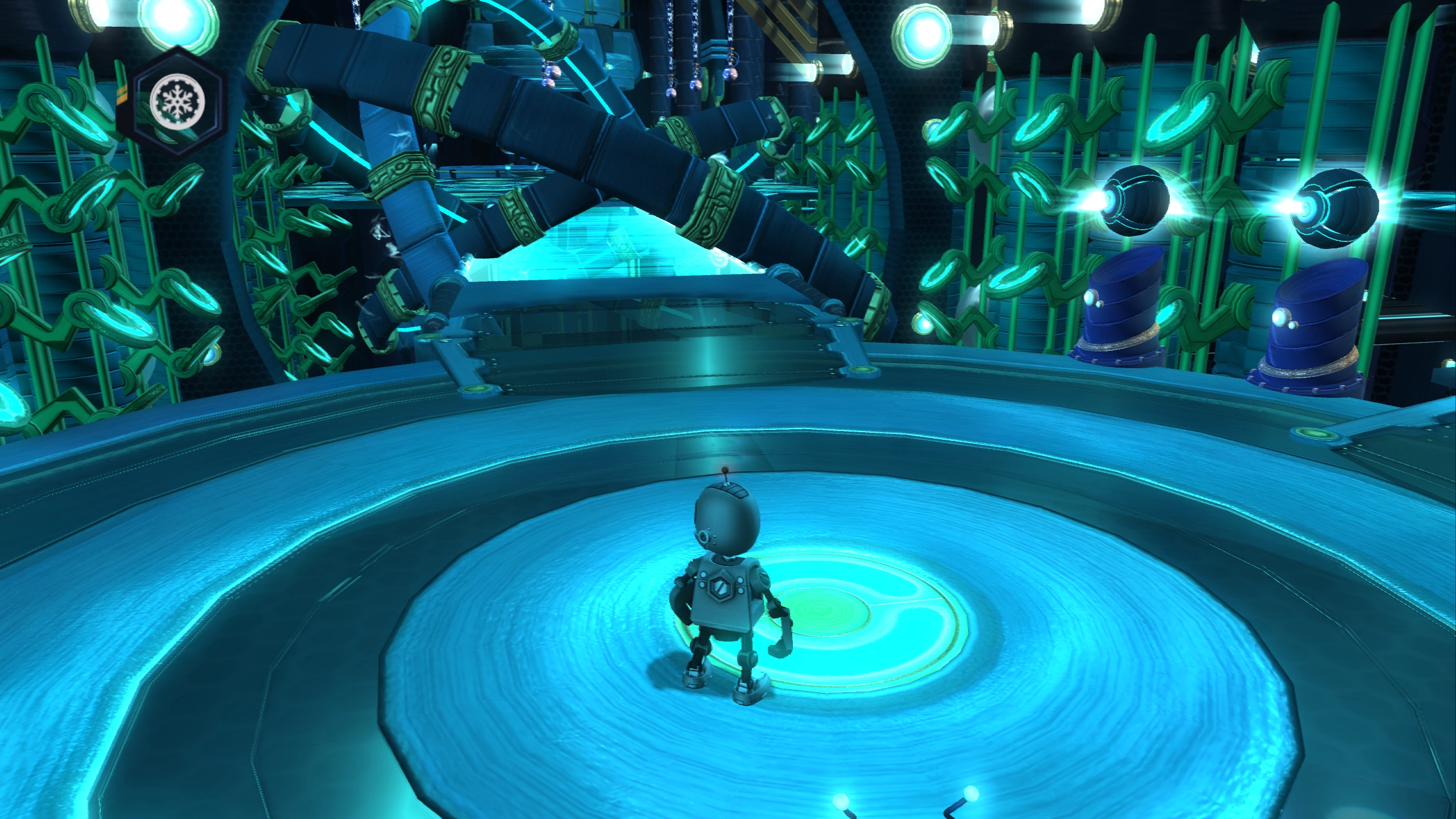 In the subsequent room, you can follow the hidden right path to acquire a single bolt, which grants a secret code for the Zoni skin in Secret Agent Clank. Return to the main path, which remains fairly linear. This path features more rapidly rotating rings, pirates (both buccaneers and corsairs), another group of Zoni that you must command, and another gate that needs to be opened with the charge command. After opening this last gate, pass through the electric barriers to reach the CPU, which can be repaired using the manipulate command, thereby concluding the mission.