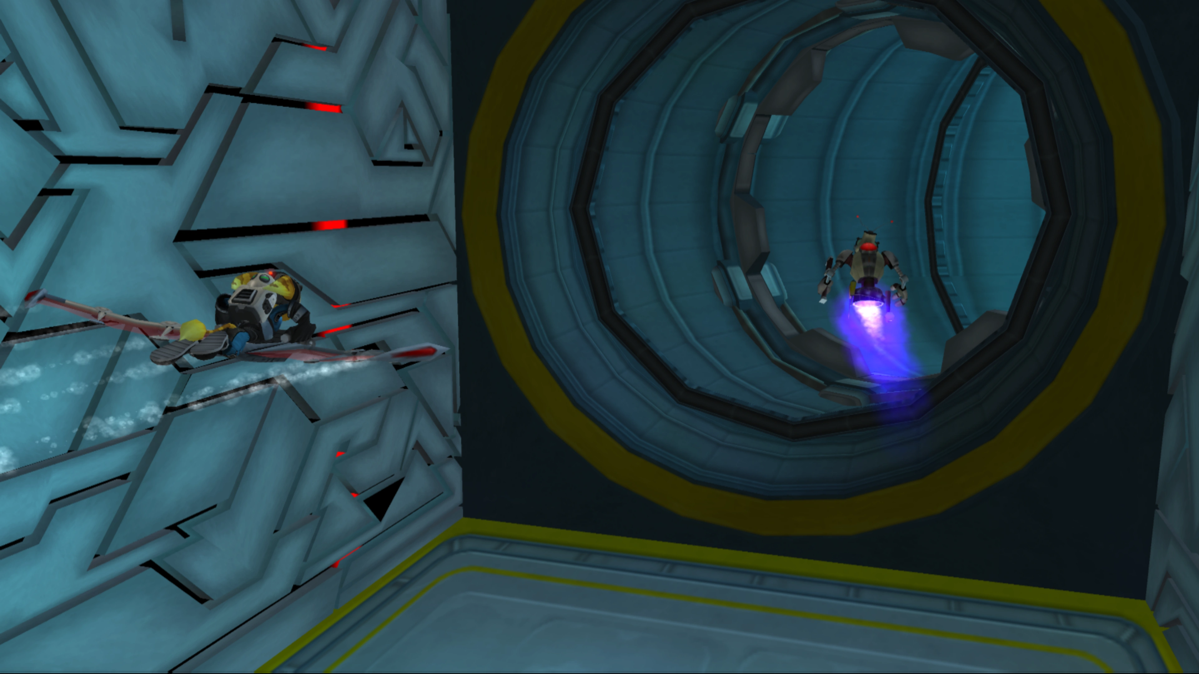 This Glider mission can be fairly challenging due to the narrow paths that must be traversed. Part of the mission is to learn the specific layout of the facility, and thus knowing how to use the Glider and what maneuver to use at what time. Start by dodging the cross-shaped metal bars, then enter a narrow area where you must dodge a number of pipes while you swerve from side to side to move through the bends in the path. Past this is a long and very narrow tunnel, which quickly curves to the right twice in a row, followed by a sharp drop and an equally sharp rise to a normal angle. Aim the Glider down and up at the right time to exit safely, then get past another cross-shaped bars section to reach the end.