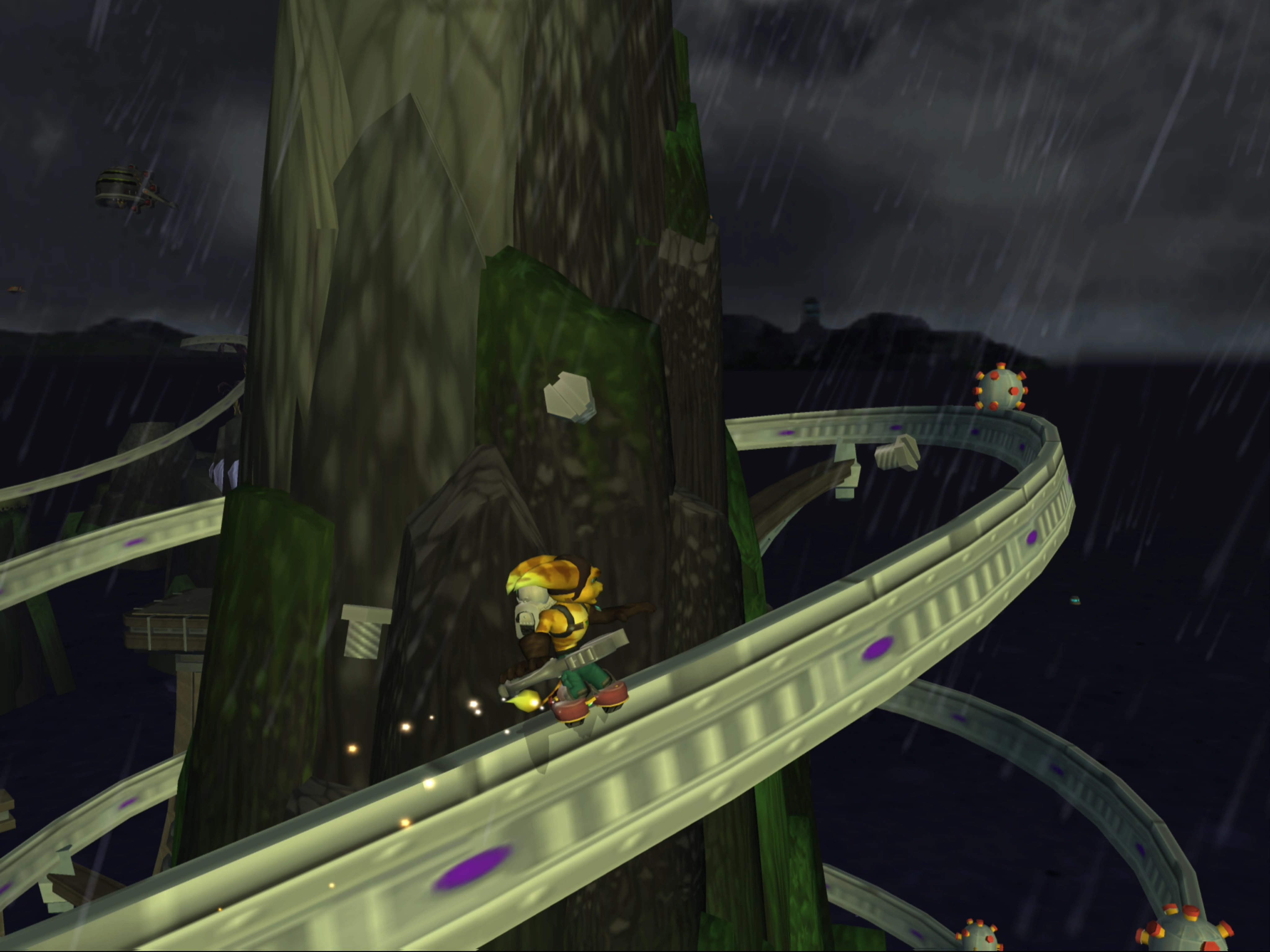 In general, always switch rails when prompted, as staying will often lead you to repeat the same section. Halfway through, mines become the most dangerous enemies, and although one is easy to avoid, it becomes troubling when they are placed shortly after another, or appear in a cluster. The angle of the camera view and Ratchet's high speed can make it difficult in some sections such as when Ratchet travels at a steep upwards angle to accurately predict when you will need to jump.