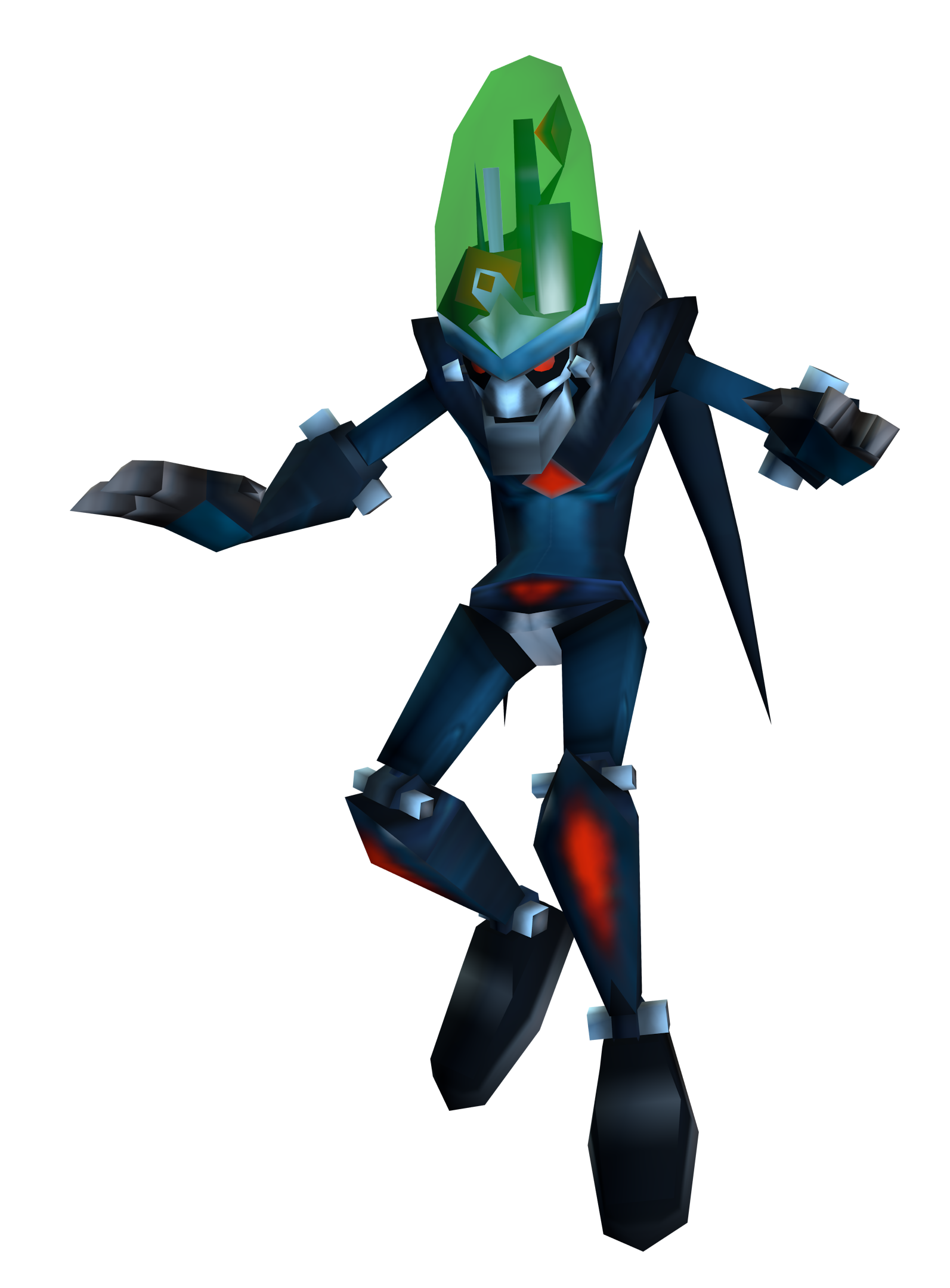 Robo-Nefarious was built to include some of the old weaponry Dr. Nefarious himself had used.[1] While hovering around the arena with its wings, Robo-Nefarious utilized two attacks against Clank. It threw energy balls that formed triangular pads on the floor, which would make electrical spaces Clank needed to avoid stepping on. It also fired streams of blue energy from its palms. The former took a split second to activate, giving Clank time to dodge using his Jet Boots, whereas the latter where similarly easy to avoid by timing your jumps carefully.