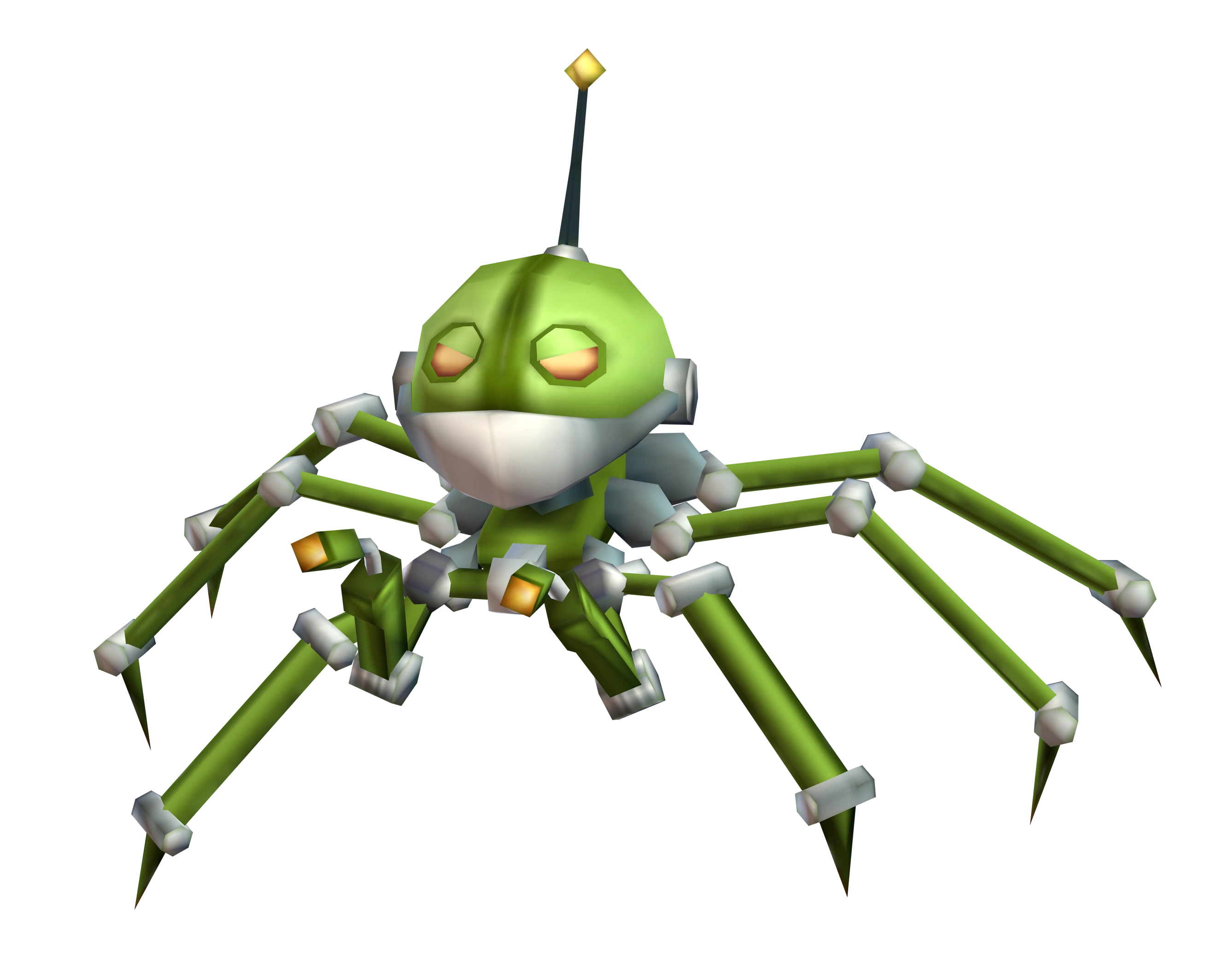 R.C.U.s comprise a single green humanoid head with yellow eyes and an antenna built on a spider-like body. They have eight limbs, six spider legs used for movement when not controlling a robot, and can also use them to walk on the ceiling, and two small limbs at the front. They only use their head to bite to attack. They are relatively intelligent, as seen in their ability to control numerous technomite robots, but otherwise function in swarms, relying on numbers. During the turret sections in the Medical Outpost they frequently attempted to use debris and objects for cover from Clank while he was controlling the turret.