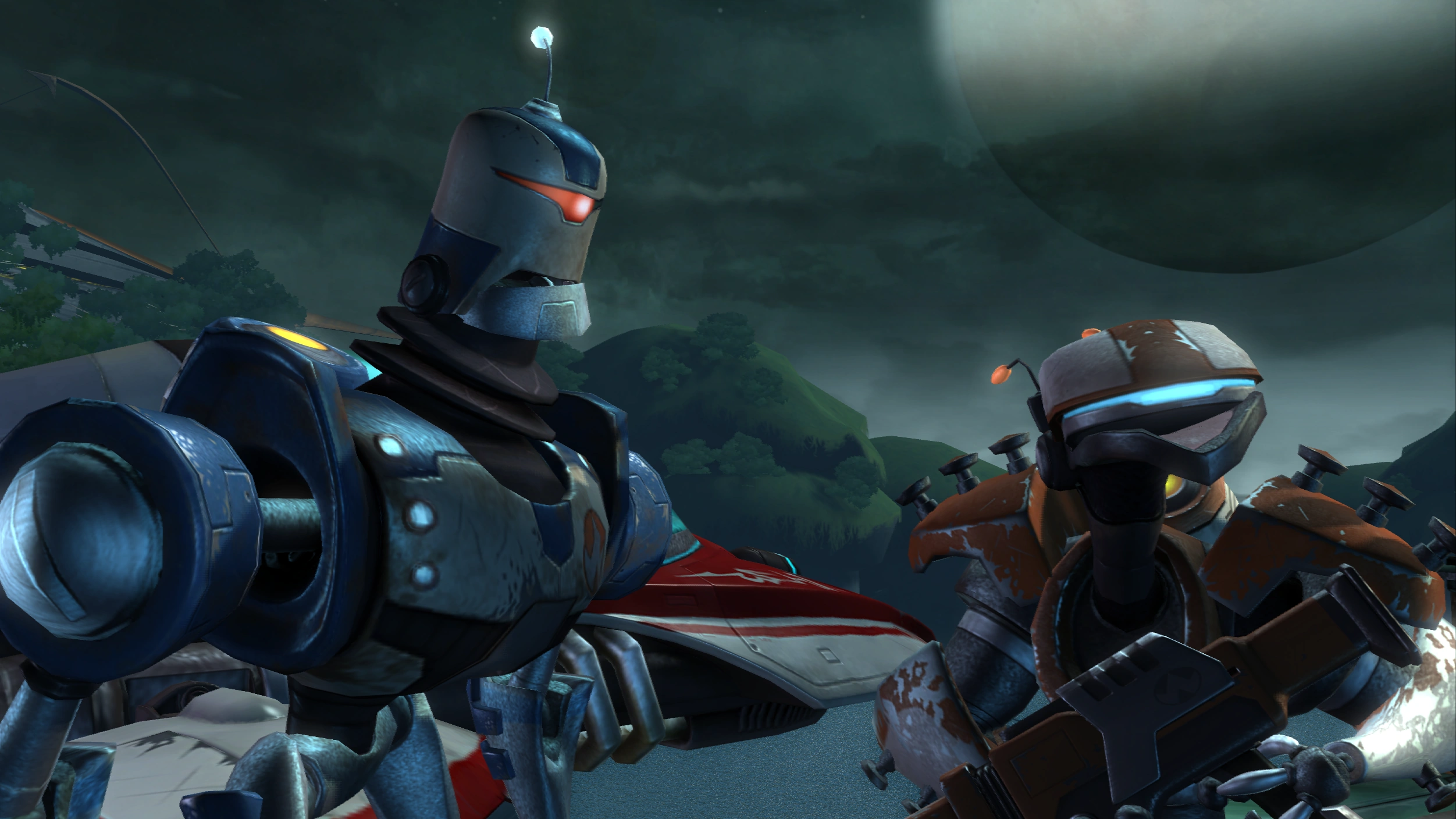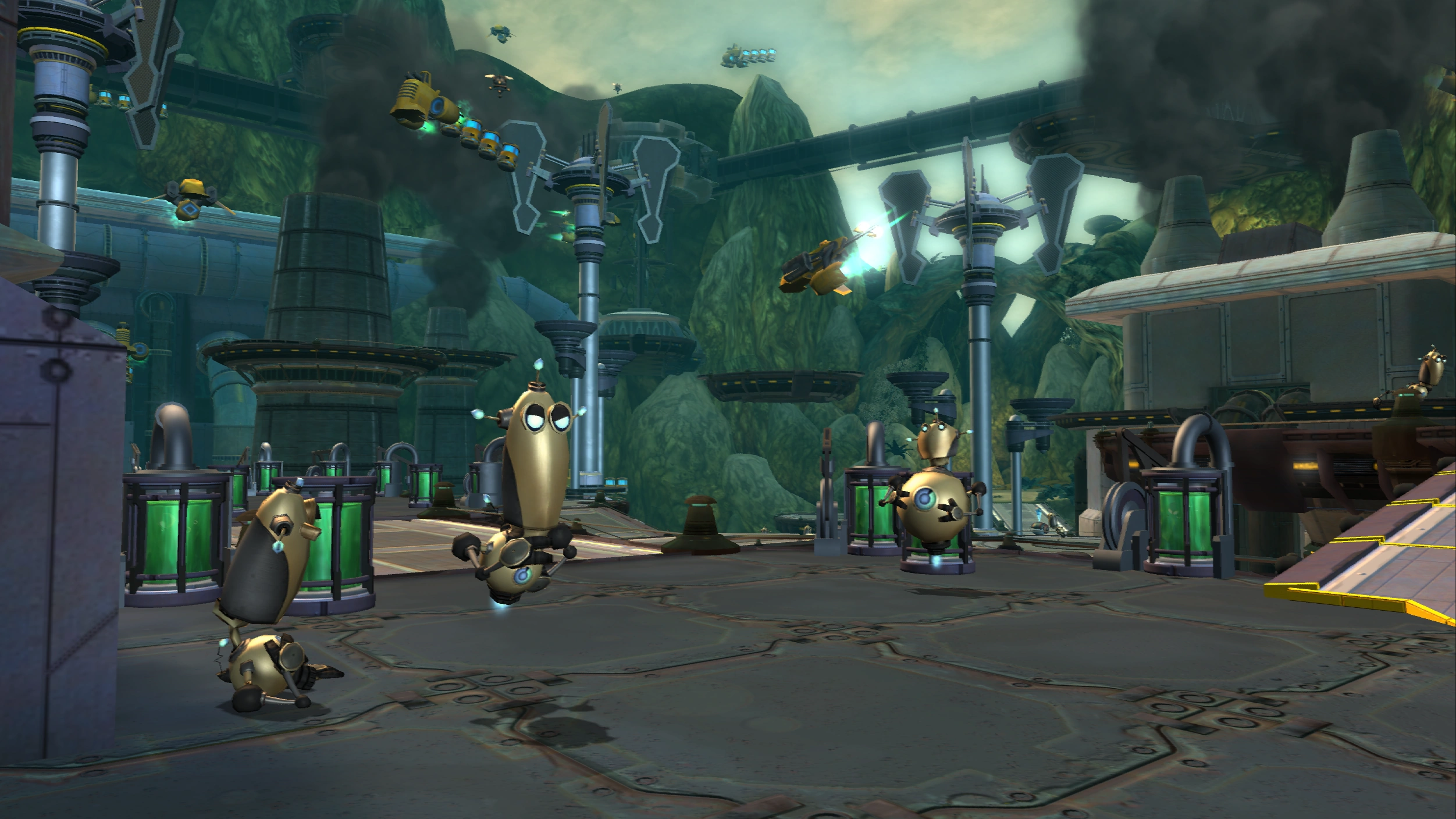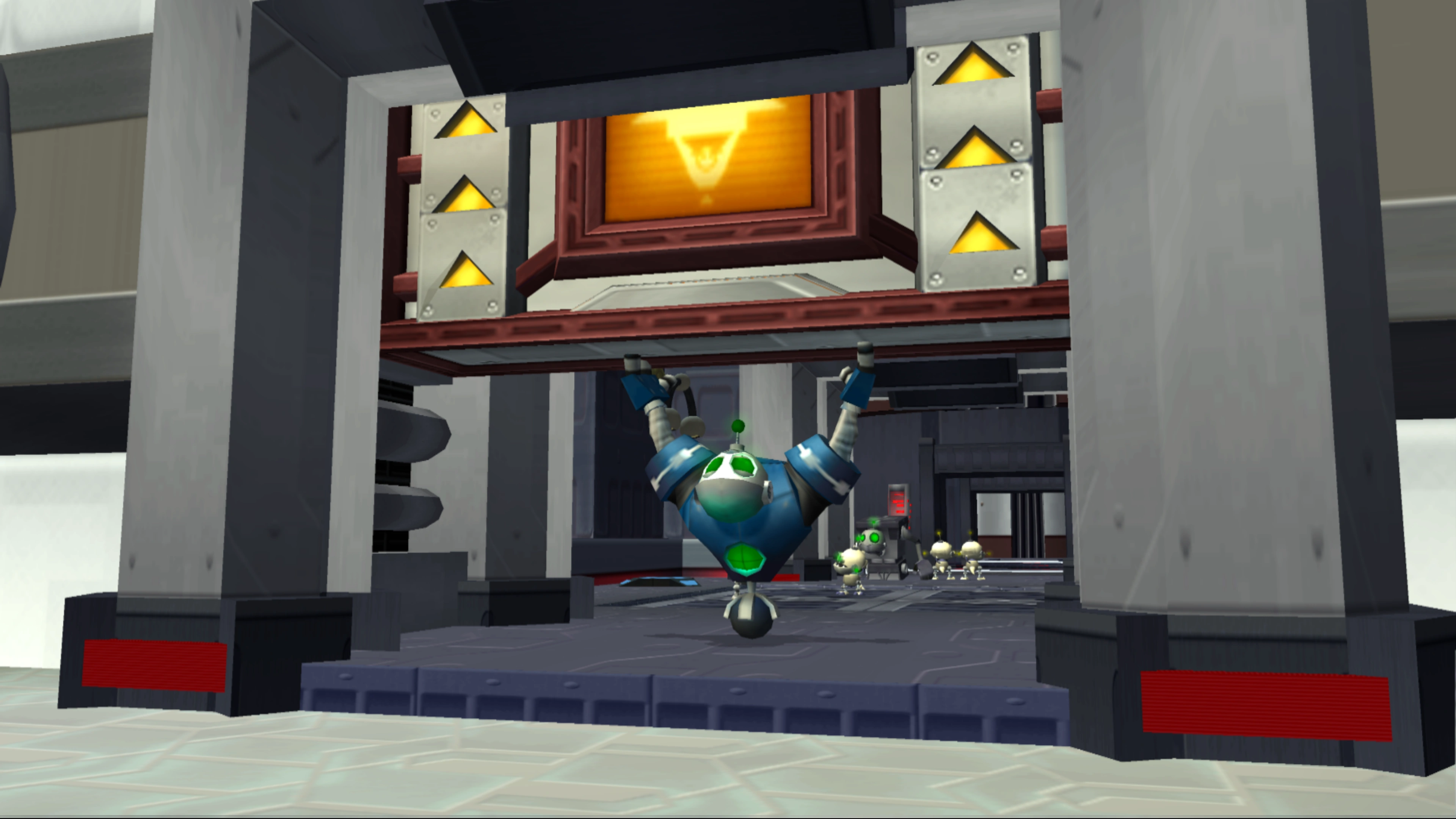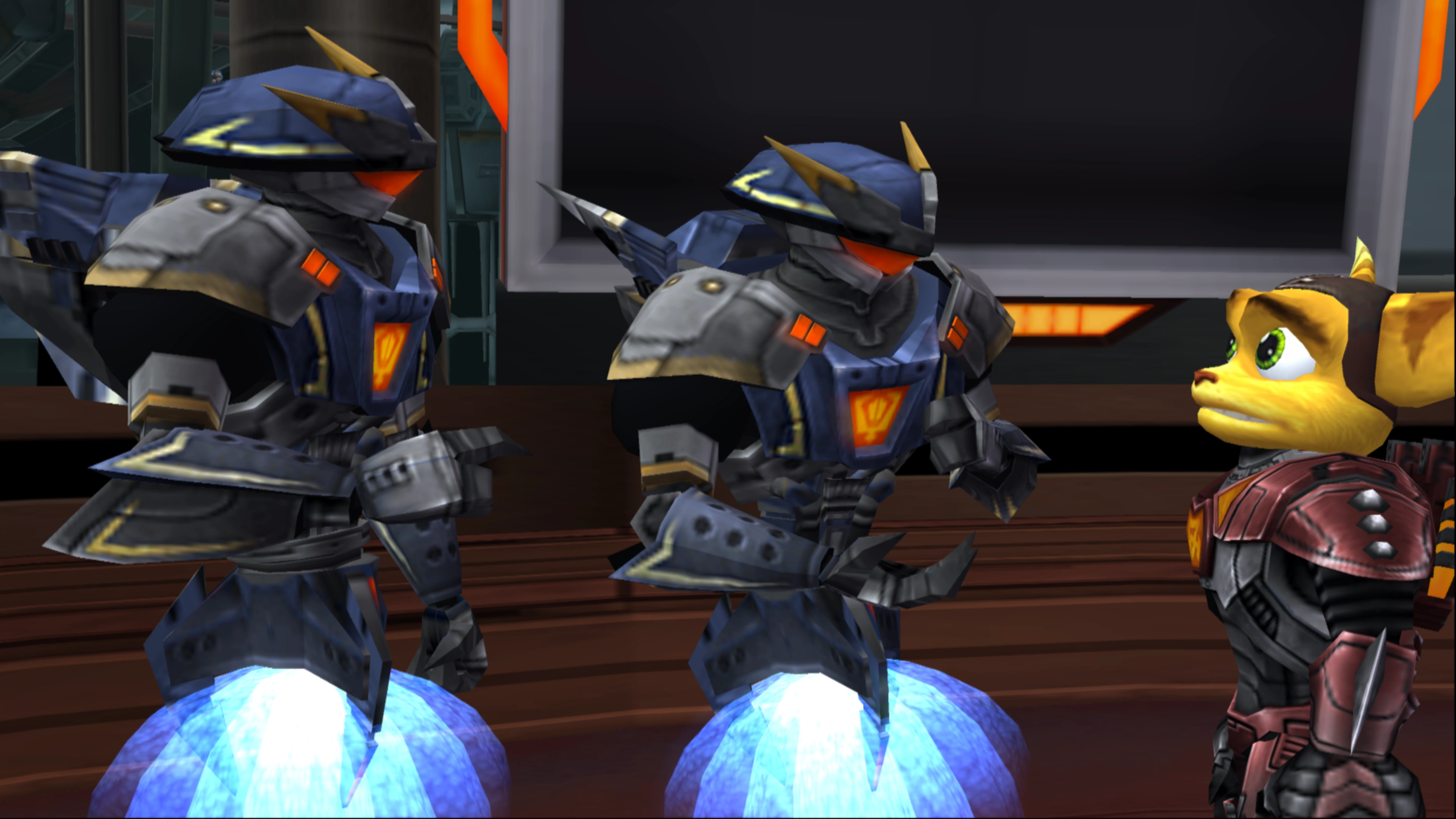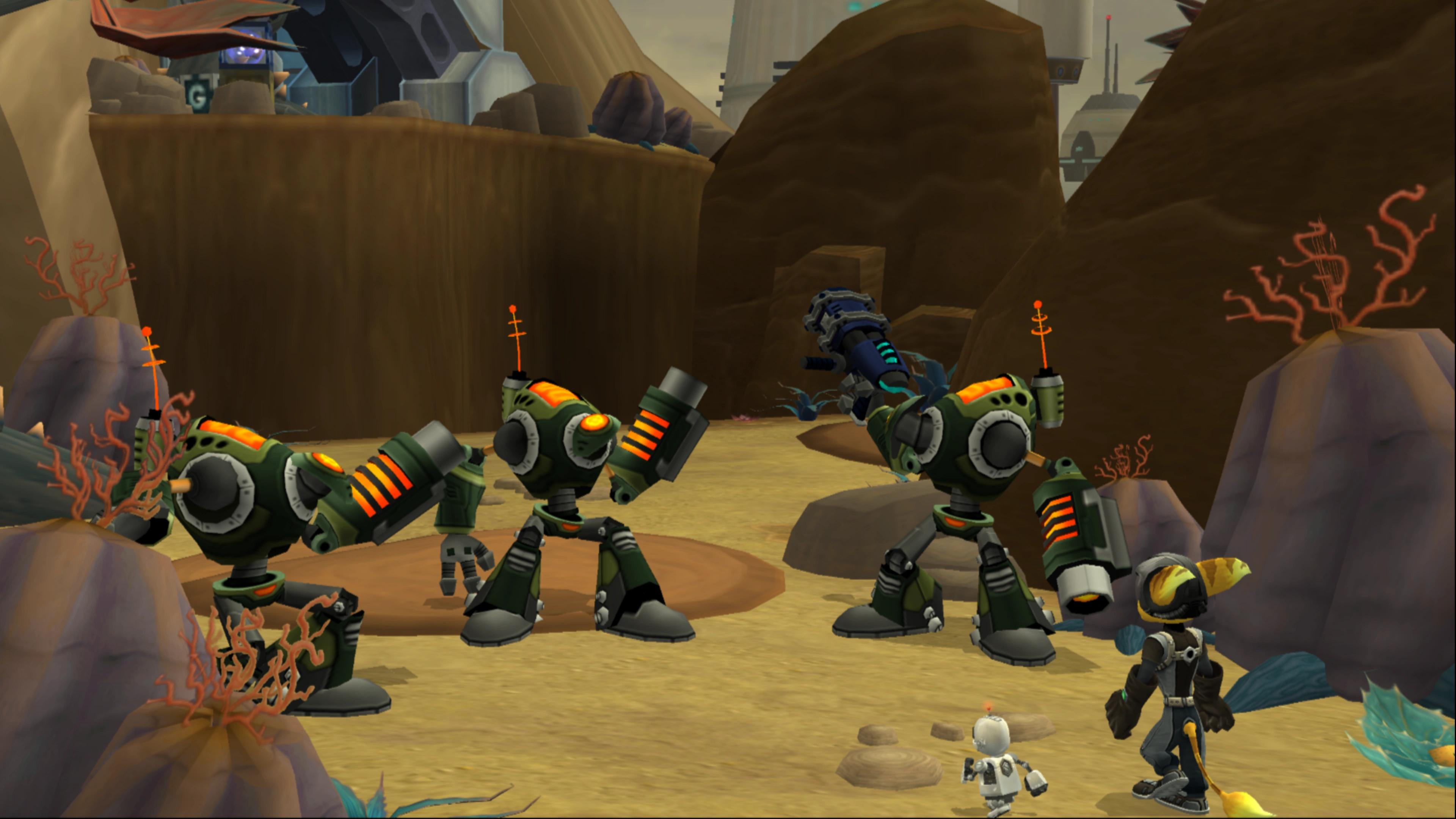 Several robots fought alongside the Galactic Rangers in Aleero City, Kerwan. Clank also made use of gadgebots on Quartu, in the Blarg Tactical Research Station, and onboard the Starship Phoenix.