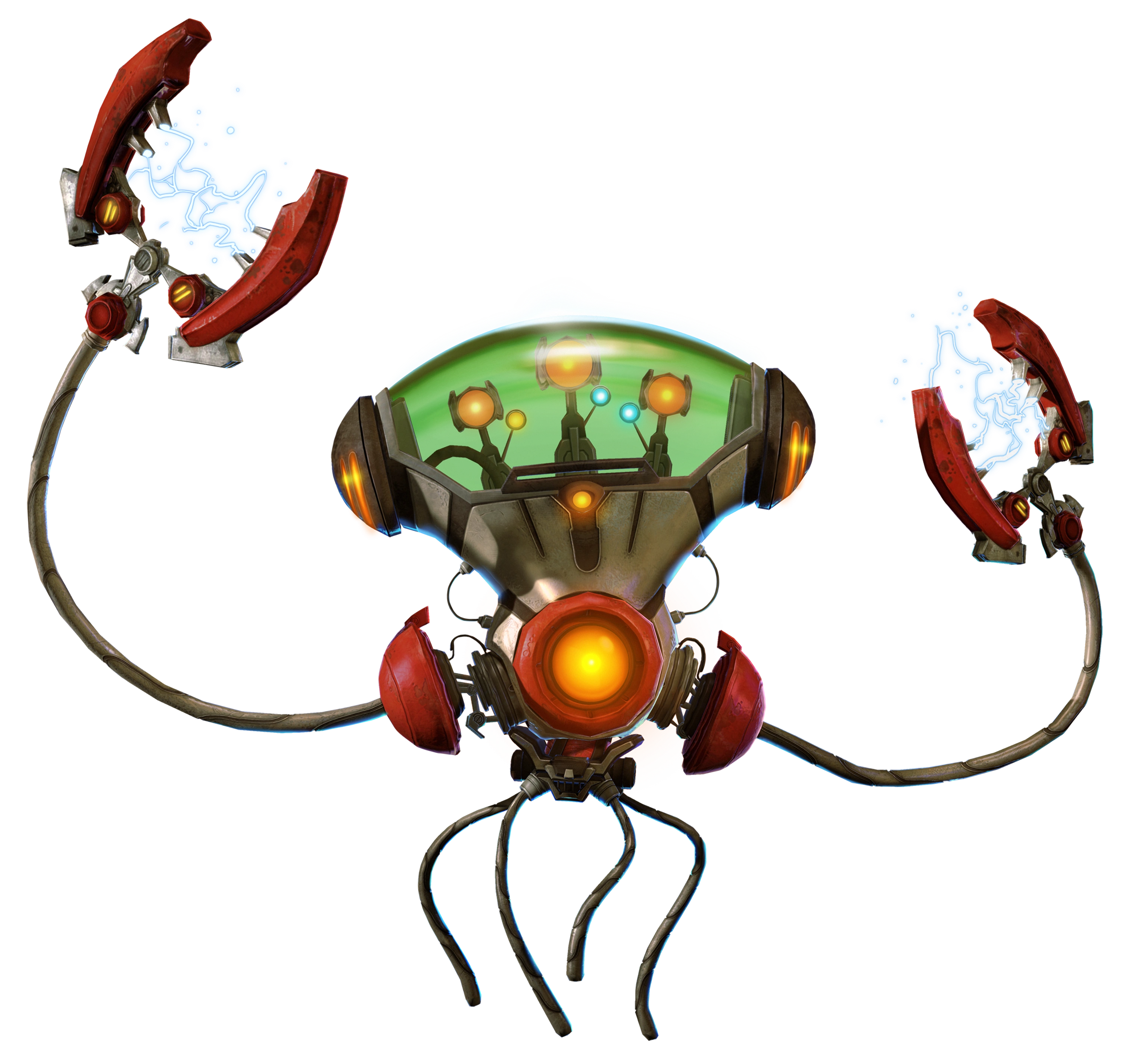 Synthenoids are small, flying robots with a weapon for a hand and slightly humanoid appearances. They are deployed as bodyguards to protect their user by firing at nearby enemies. Ratchet used both Megacorp's own Synthenoids, as well as the more common synthenoid made by GrummelNet, Mr. Zurkon and his family, Zurkon Jr. and Mrs. Zurkon.