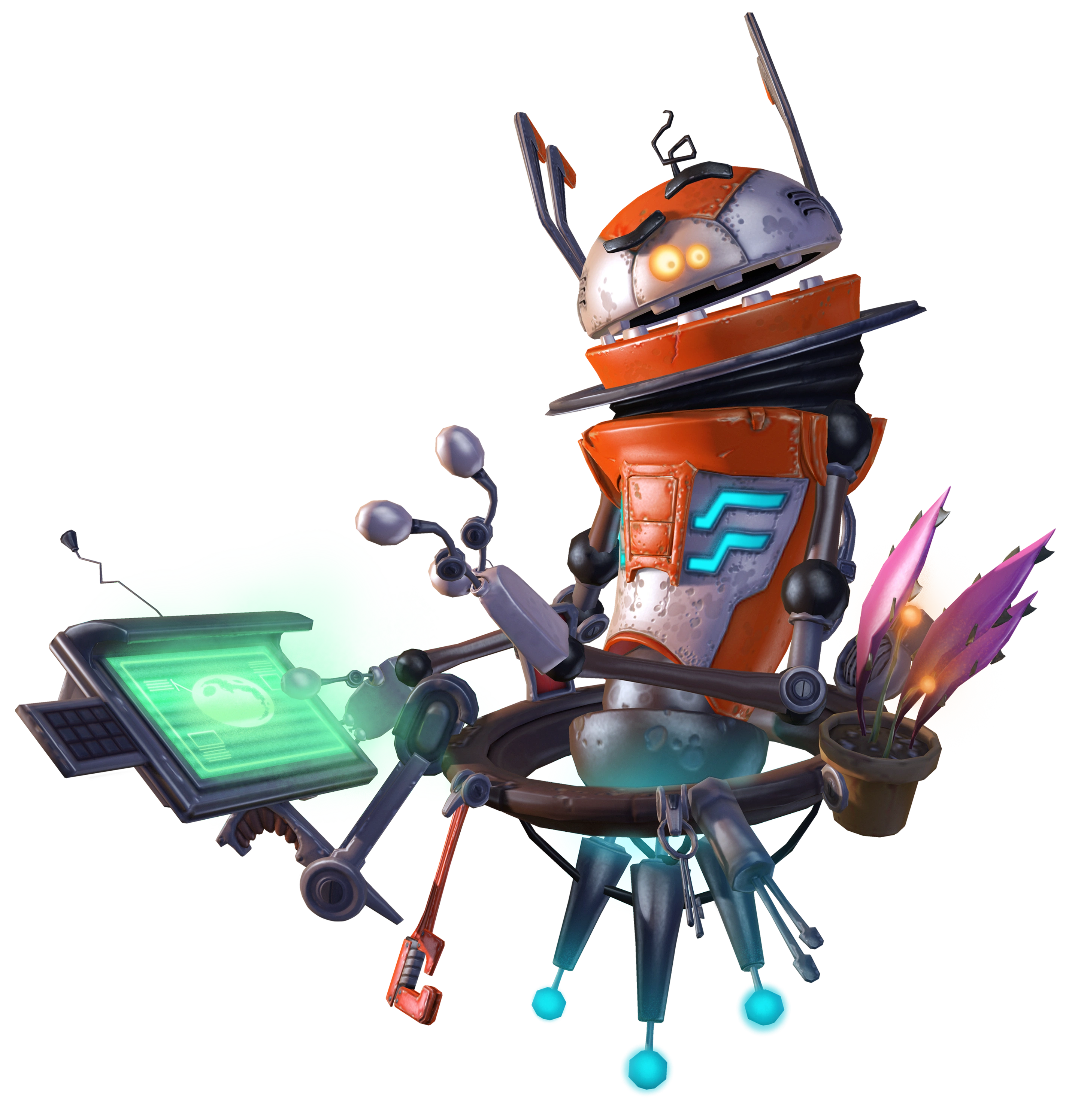Controller robots known as operators were used throughout All 4 One for operating various machines, in Luminopolis, and used by both the collector minions and Dr. Frumpus Croid. Dr. Croid used an army of giant guardian robots and Croid Bots piloted by operators to protect his laboratory in Terawatt Forest from the collector minions. One of the guardian robots was reprogrammed by Cronk and Zephyr using a cranial mood reshifter and became an ally with its own personality, which Qwark named Leon. Consumer bots also appeared throughout the Luminopolis rooftop amphitheatre. Mr. Zurkon was purchasable from GrummelNet through Apogee Industries Communication Pods and could be upgraded to the Elite Mr. Zurkon.