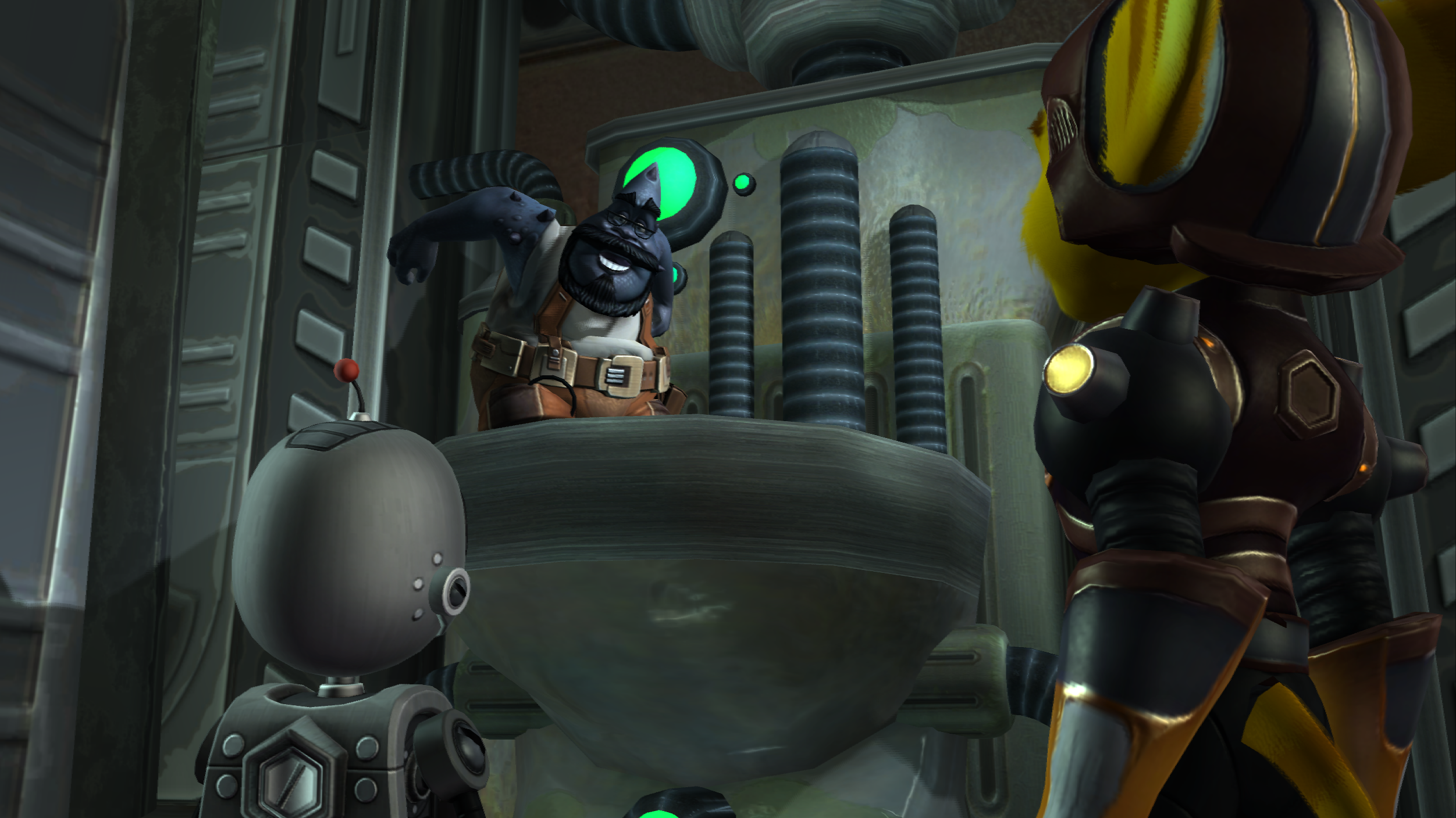 Ratchet and Clank came to Sargasso in search of the Dimensionator. There, the two found the Smuggler, and traded leviathan souls with him for bolts, while searching for the lombax testing facility. At the facility, the two encountered the Plumber.