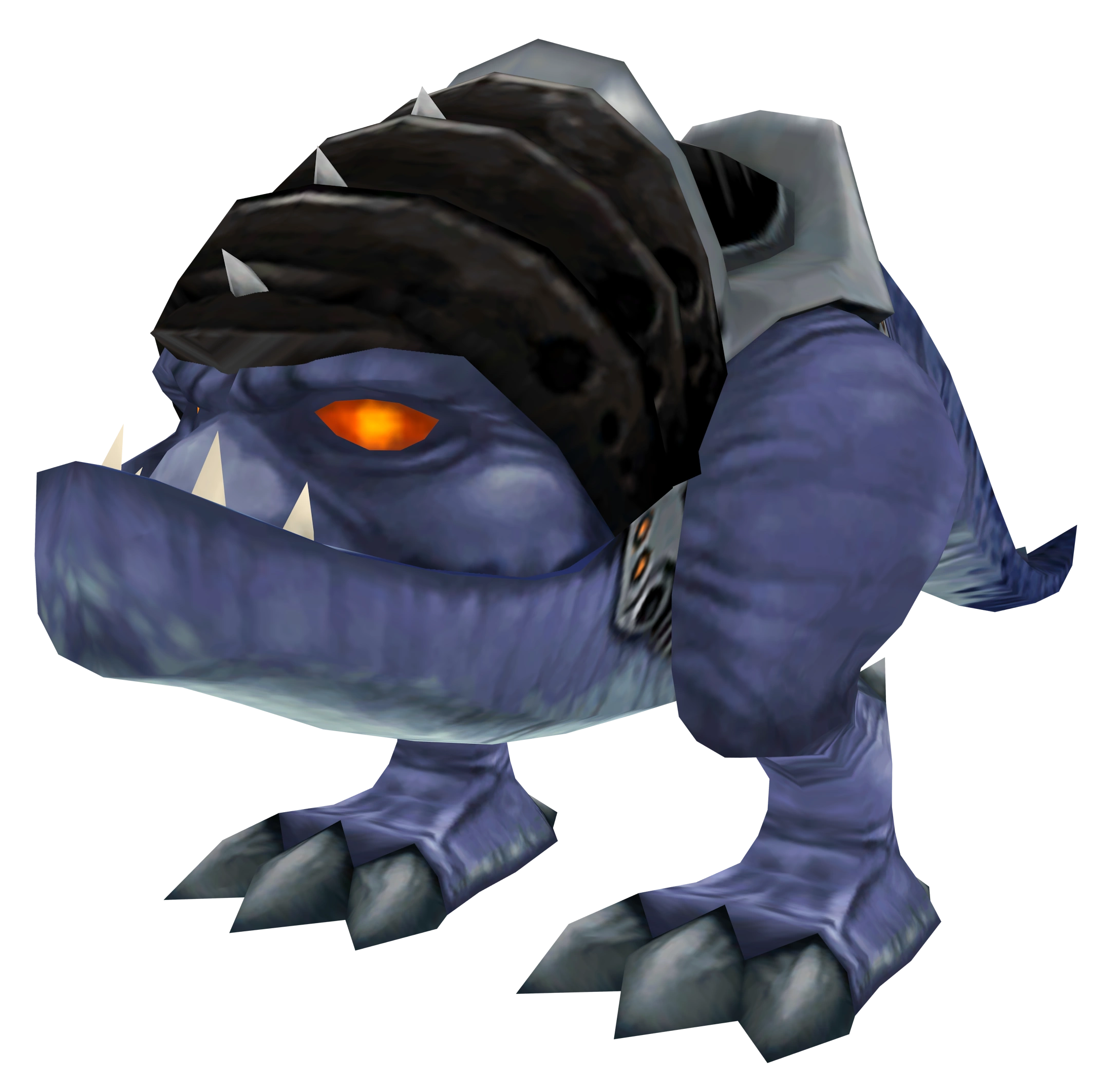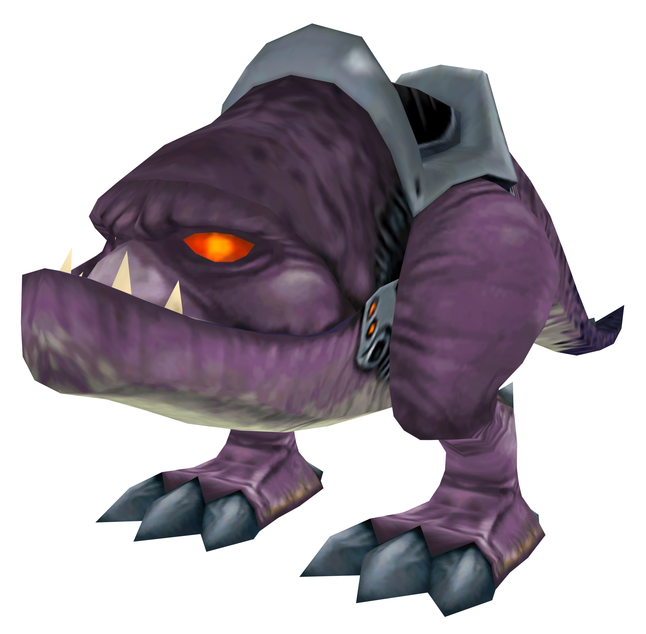 Barlowian saur-beasts are large, bipedal creatures with purple skin, a massive head and jaw, and a stubby tail. They are naturally harmless herbivores, but were trained by tribesmen to be savage beasts,[1] and wear spikes and a saddle on their back. The Jobian saur-beasts have a thicker shell due to their adaptation to Joba's harsh climate.[1] They are identical in appearance to the Barlowian saur-beasts, aside from having a purple skin tone and additional armor covering the top of their head.