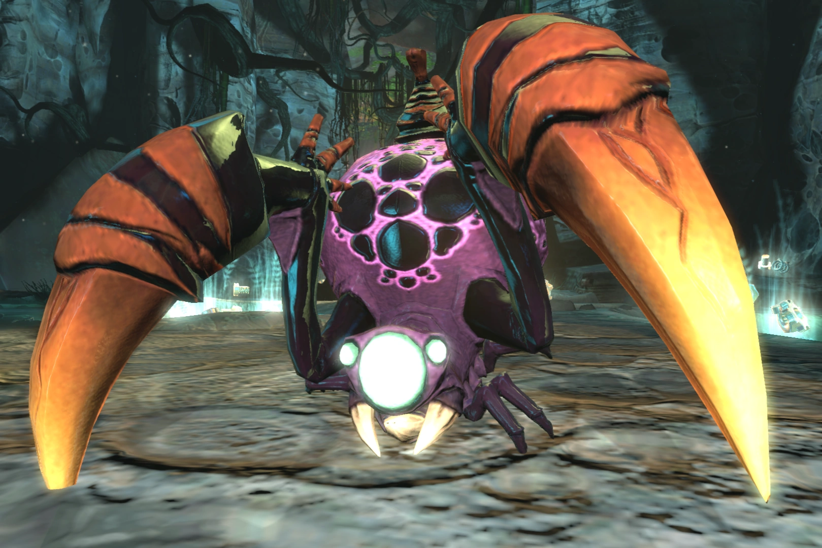 Serathoids[1] are enemies in Into the Nexus. They are small, three-eyed, arachnid-like creatures, with two limbs sporting massive spikes used to attack prey. Serathoids inhabit the Zarkov Sector of the Azeril Caverns, usually in dark and damp places. They are often found skittering along the walls, dug into the ground ready to ambush prey, or seen inhabiting large lumpy purple nests.