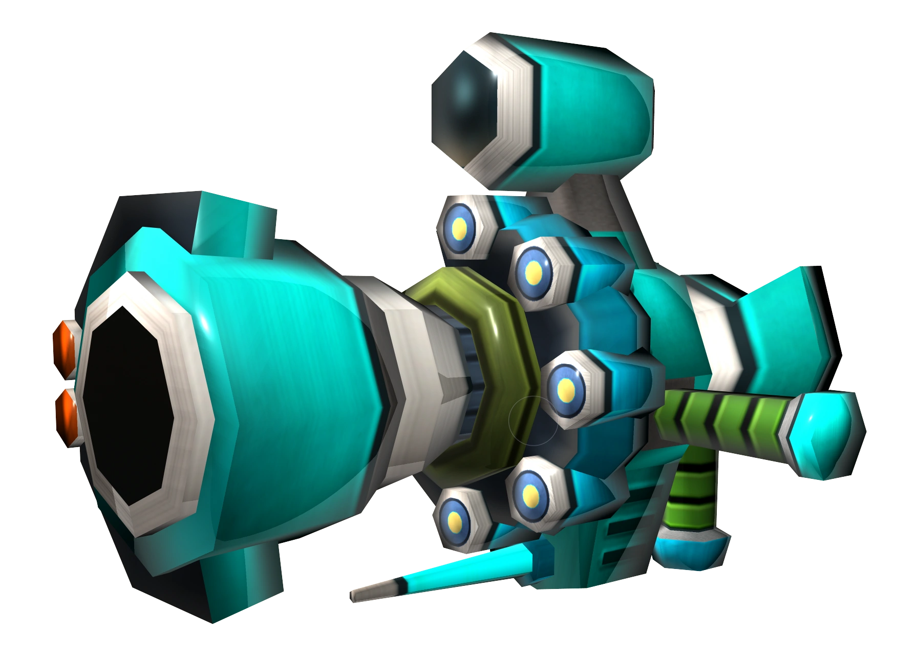 The Shard Gun is a long, cyan-colored shotgun with some minor green and silver highlights. It features a scope at the top, and the gun's barrel is surrounded by small cylinders. The scope on the Shard Cannon is made even wider, with extra tubing added to both the scope and the muzzle.