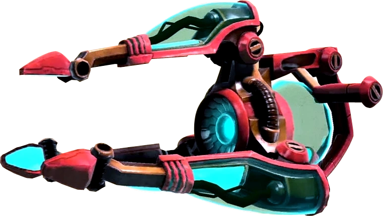In Ratchet & Clank, the Sheepinator has a different design. It is a red carbine weapon held by a trigger handle and grip on the left, with three claws in a triangular shape and blue highlights, which fires a continuous stream against enemies and transforms them to sheep. The Goatinator features a similar but larger design.