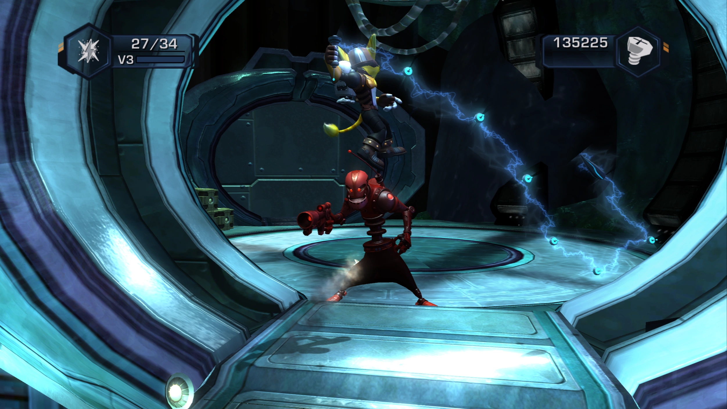 The Shock Ravager is a melee weapon with a medium range. Its main advantage is its ability to stun enemies briefly, and particularly, to make shielded enemies vulnerable and bypass their shields. It however is incapable of damaging electric enemies, and as a melee weapon, is ineffective against most flying enemies. It has high damage and a decent area of effect. Because Ratchet physically takes time to swing the weapon it can be faster and easier to use while jumping, as this also allows more control over Ratchet's movement, and makes it easier to avoid enemies from up close.