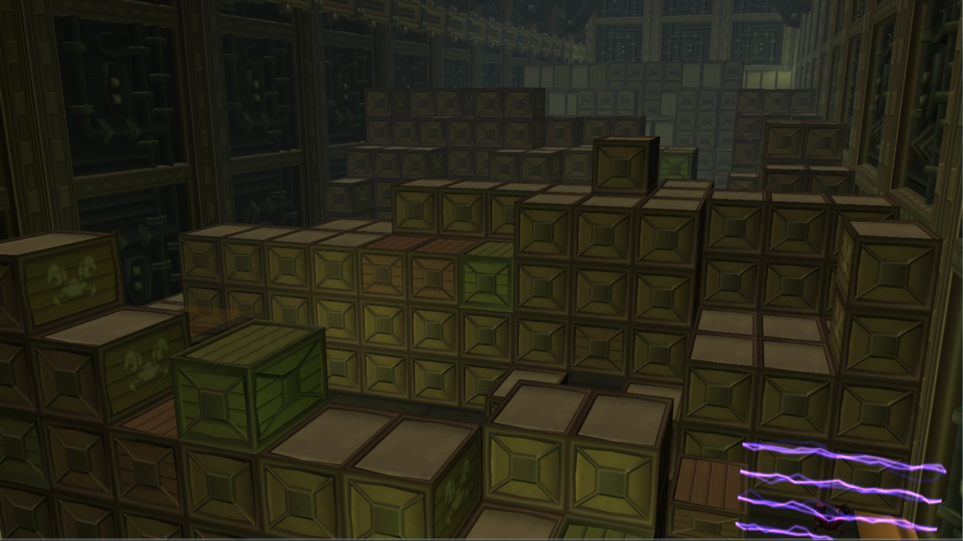The warehouse, visited in "Traverse the Warehouse", in the first part of the "Search the Distribution Facility" mission is the largest freighter vessel in the facility. It is a massive ship filled with large crates, most of which contain Protopets,[1] while many others contain two-headed Smolgian snappers. These crates are stacked around the facility and moved by small cranes and conveyor belts, which can be activated using the Dynamo. Navigating the warehouse involves moving through paths alongside these crates, and entering the facility requires using a jump pad to enter an opening at the back. On the right of the warehouse is a balcony with a rail connecting to an adjacent structure.