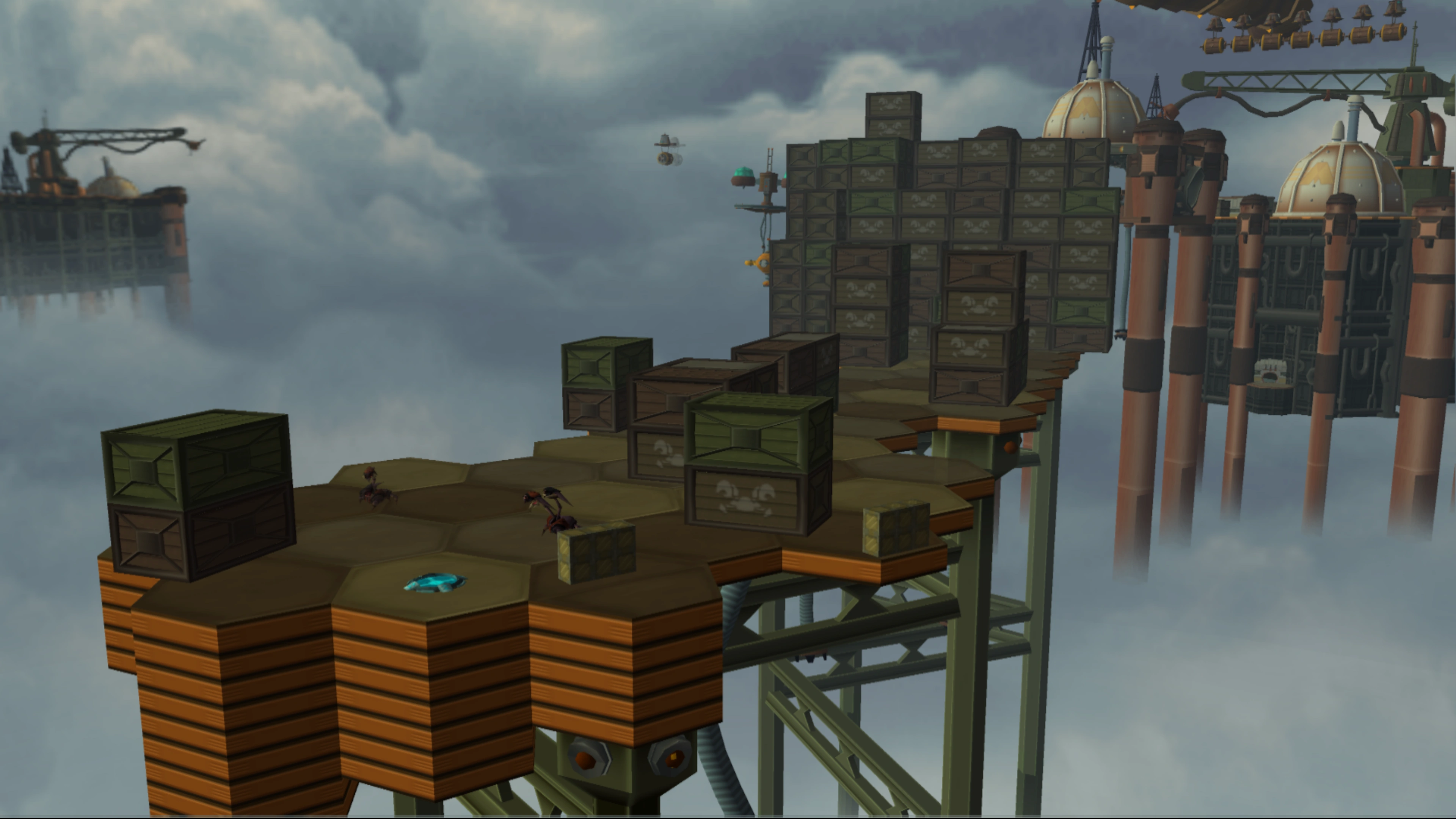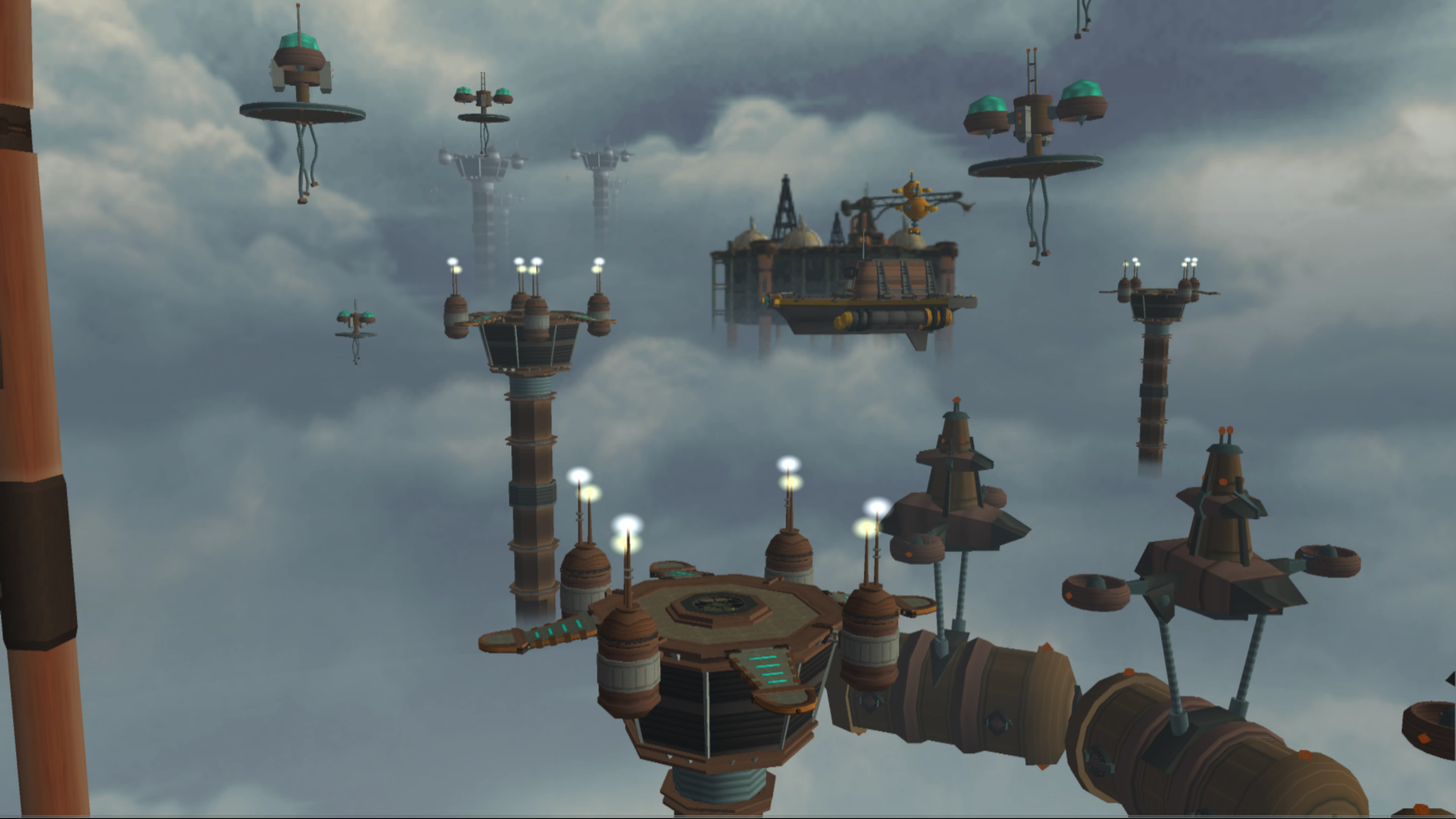 As much as from space and in the area Ratchet visits, there appears to be no evidence of a surface, with the entire planet being covered in thick fog or clouds. Only extremely tall support pillars holding up some of the largest structures, and several smaller ones holding up separate platforms (such as the landing pad) hint at the existence of a bottom. Aside from these, the distribution facility consists only of freighter vessels and floating platforms. Despite the smoggy atmosphere, the air remains breathable.