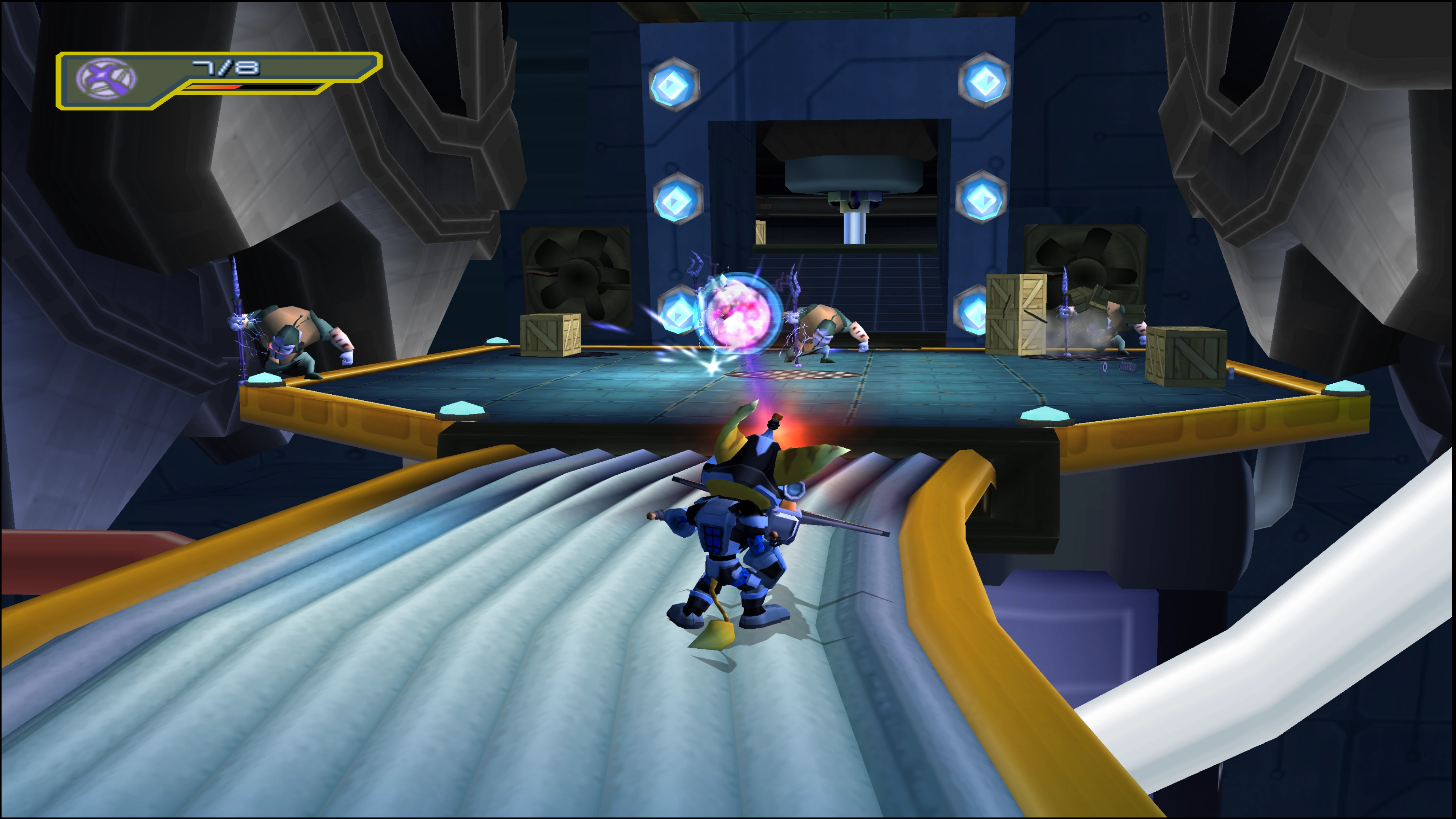 The Sniper Mine is a long distance weapon that deals more damage the further away it is fired. It will either explode on contact with an enemy, or latch onto a surface and explode when an enemy comes nearby. This makes it ideal for firing at targets further away from the player, or for taking out medium to large enemies before entering an area to fight them. However, it is extremely difficult to aim particularly in combat, and is better fired at enemies not already engaged in combat with Ratchet. The Deadeye Mine creates more explosions in the surrounding area after the first one hits, making it more effective at firing against clumps of enemies.