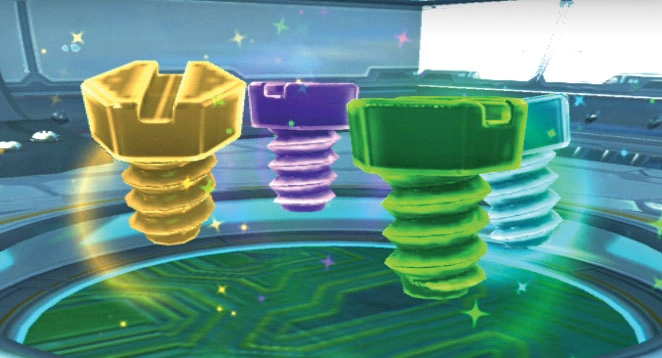 Forty titanium bolts are found throughout most the locations, with one as a reward for the Nerves of Titanium challenge on the VR deck, and five in total for completing each Qwark vid-comic with all 100 Qwark tokens collected. They are solely used for purchasing extra skins in the Special menu.