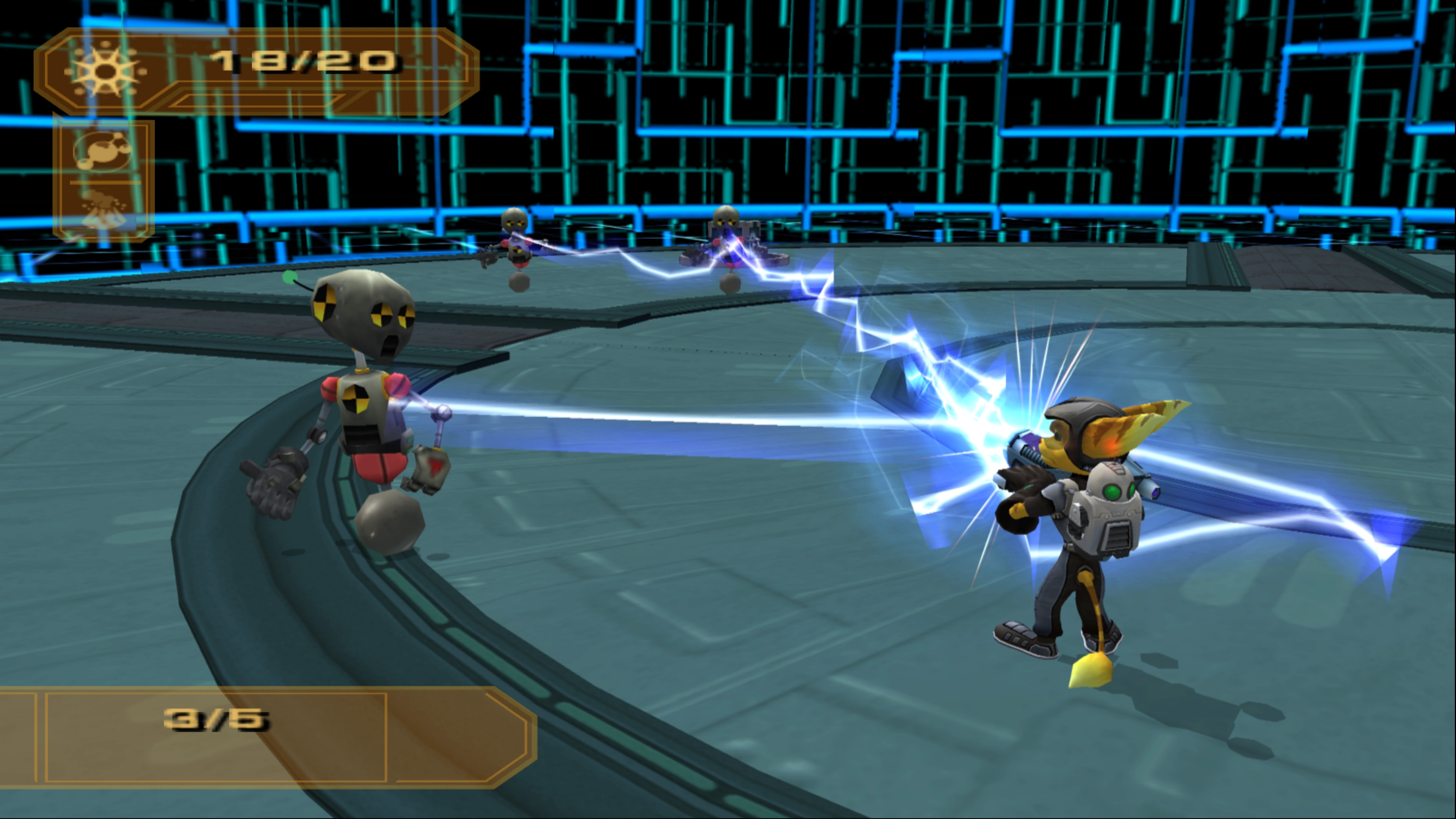 Ratchet using the Spitting Hydra against test dummies in the VR deck.