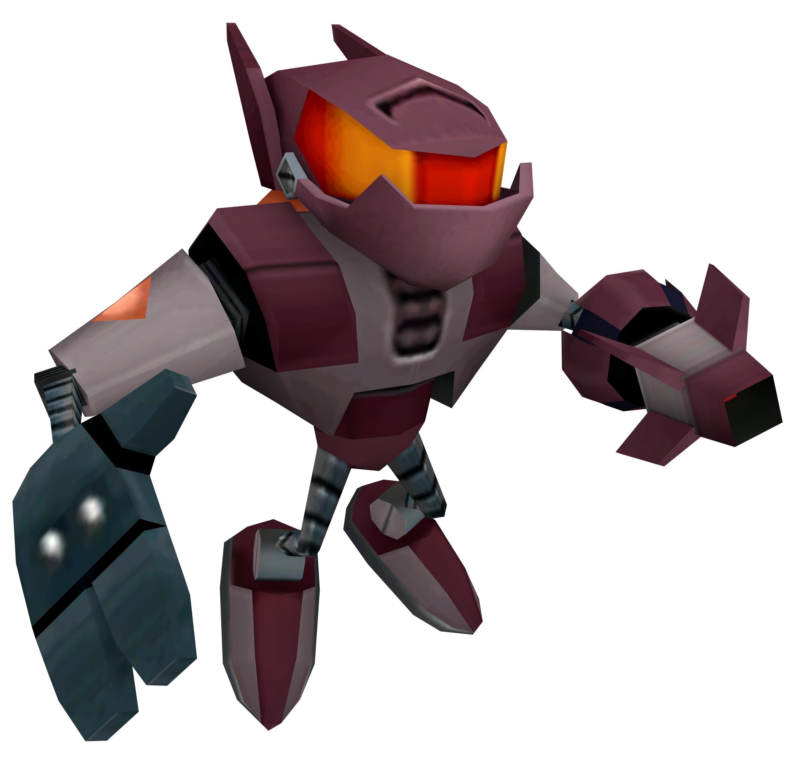 Synthenoids are small, silver and dark blue humanoid robots. On their right arm is a large hand, whereas their left arm has the weapon they use to shoot. Their head has a wide orange-red visor and on the back is a small thruster. The Kilonoid features a red design with an upgraded weapon, but is otherwise identical in appearance.