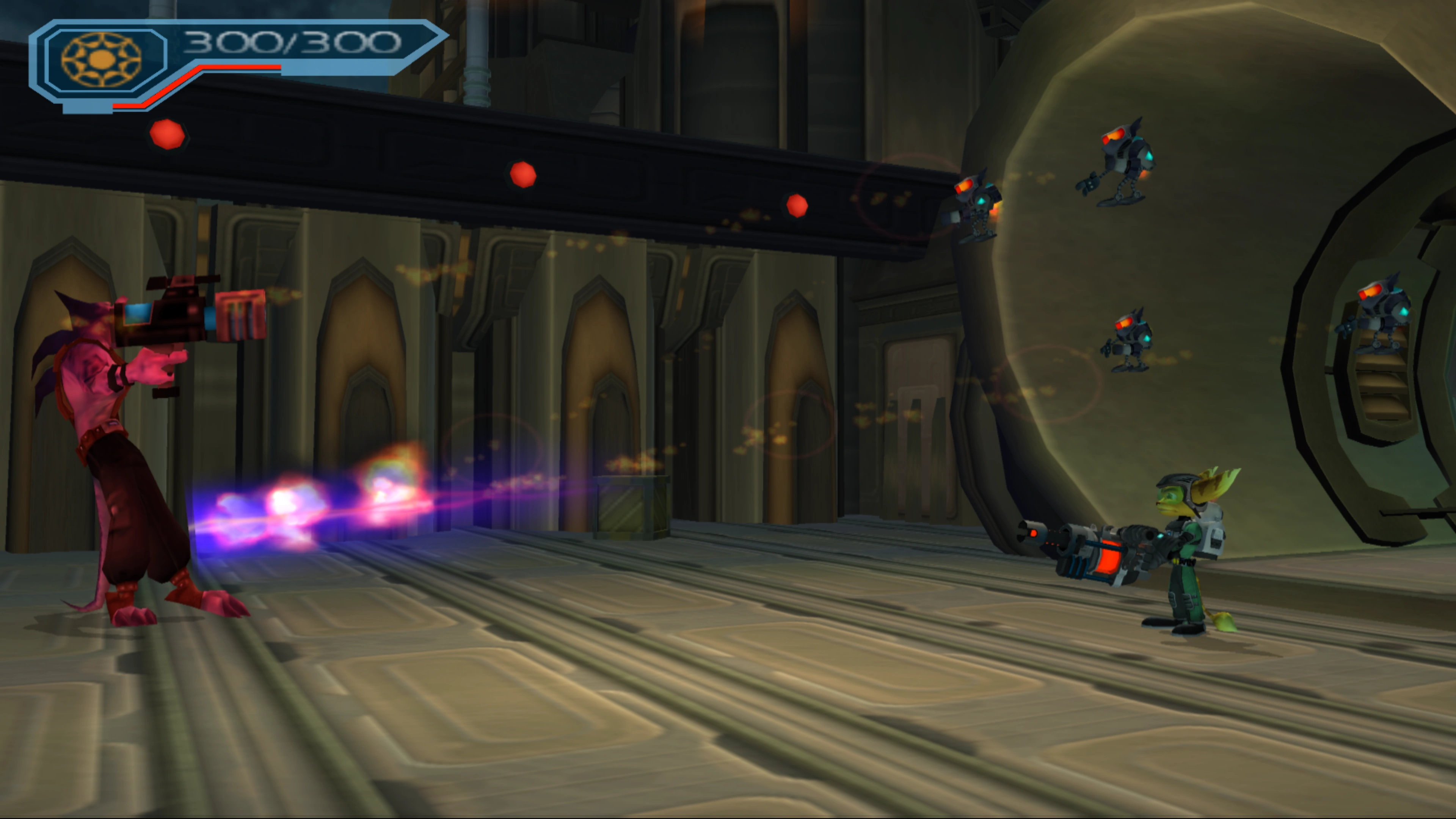 Four Synthenoids are deployed at once, and will hover around Ratchet, firing at enemies they come in range with. A Synthenoid will fade away once its energy blasts have been depleted or once enough time has gone by. Their energy blasts have a decent rate of fire and do good damage over its lifespan. Sythenoids are therefore very versatile, and good against all types of enemy.