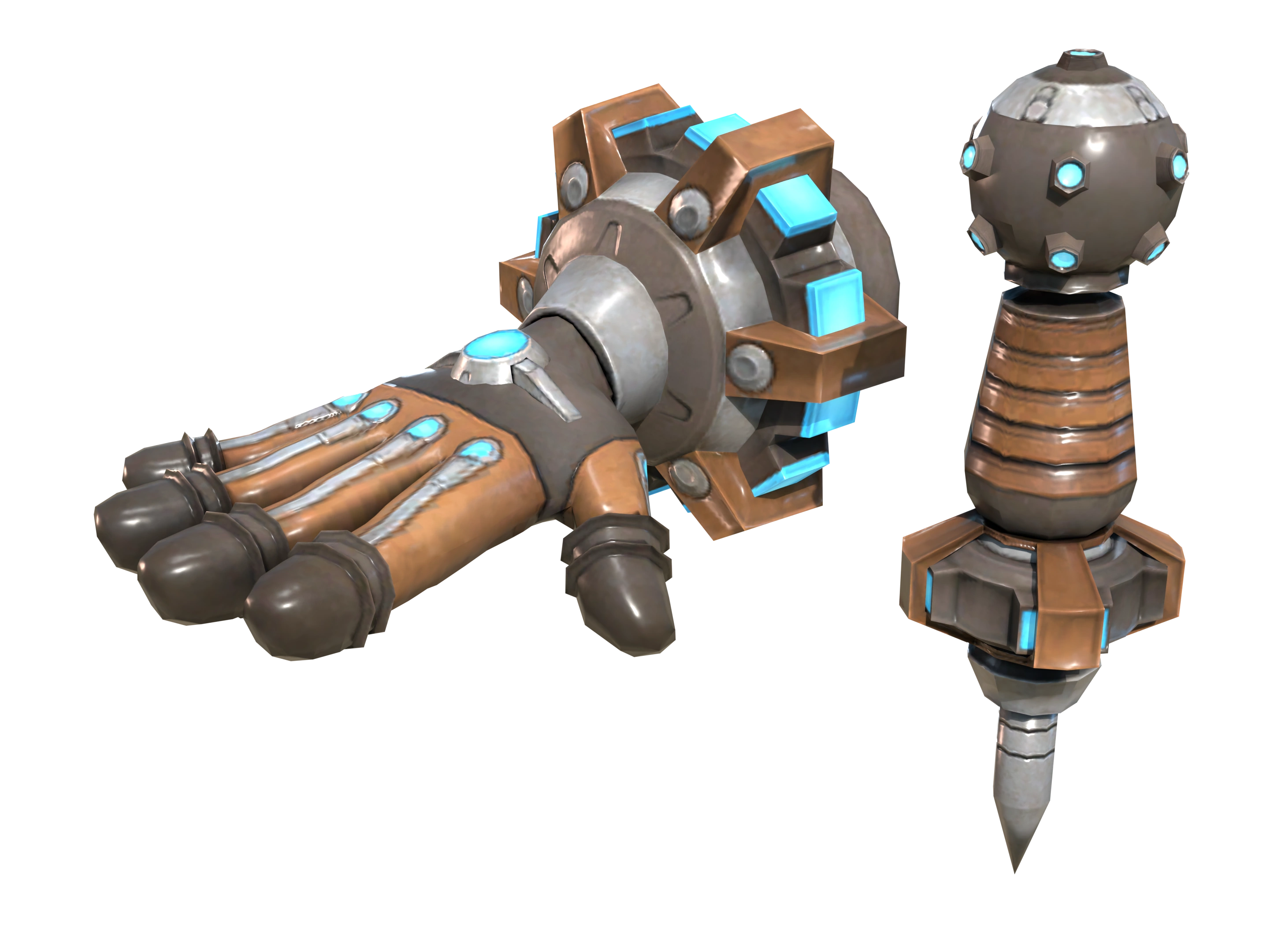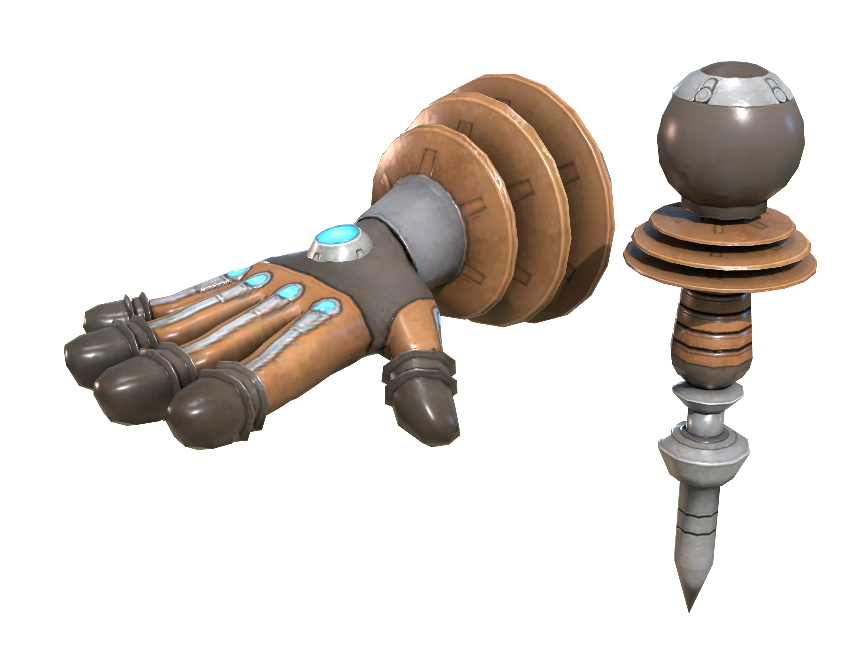The Storm Spikes glove is bulkier around the wrist area, featuring a thick gear that rapidly spins when the weapon is equipped. The individual spikes also undergo a transformation upon upgrade, adopting a smooth, gear-like appearance.