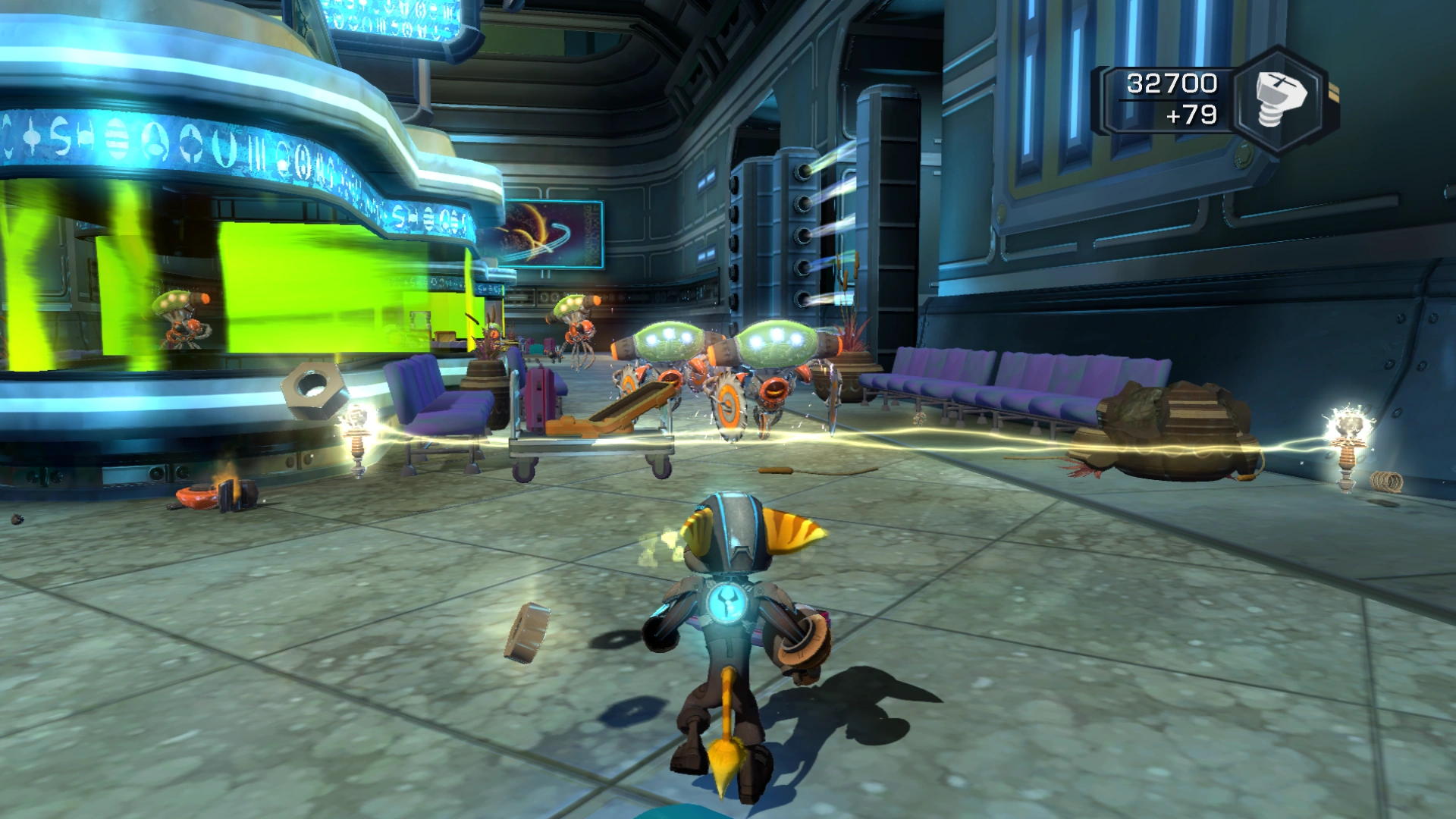 The Tesla Spikes can be obtained on the planet Terachnos for 19,000 bolts. With continued use, they can be upgraded to the Storm Spikes, which can shock enemies close to one already affected. In challenge mode, the Omega Storm Spikes can be purchased for 205,000 bolts.