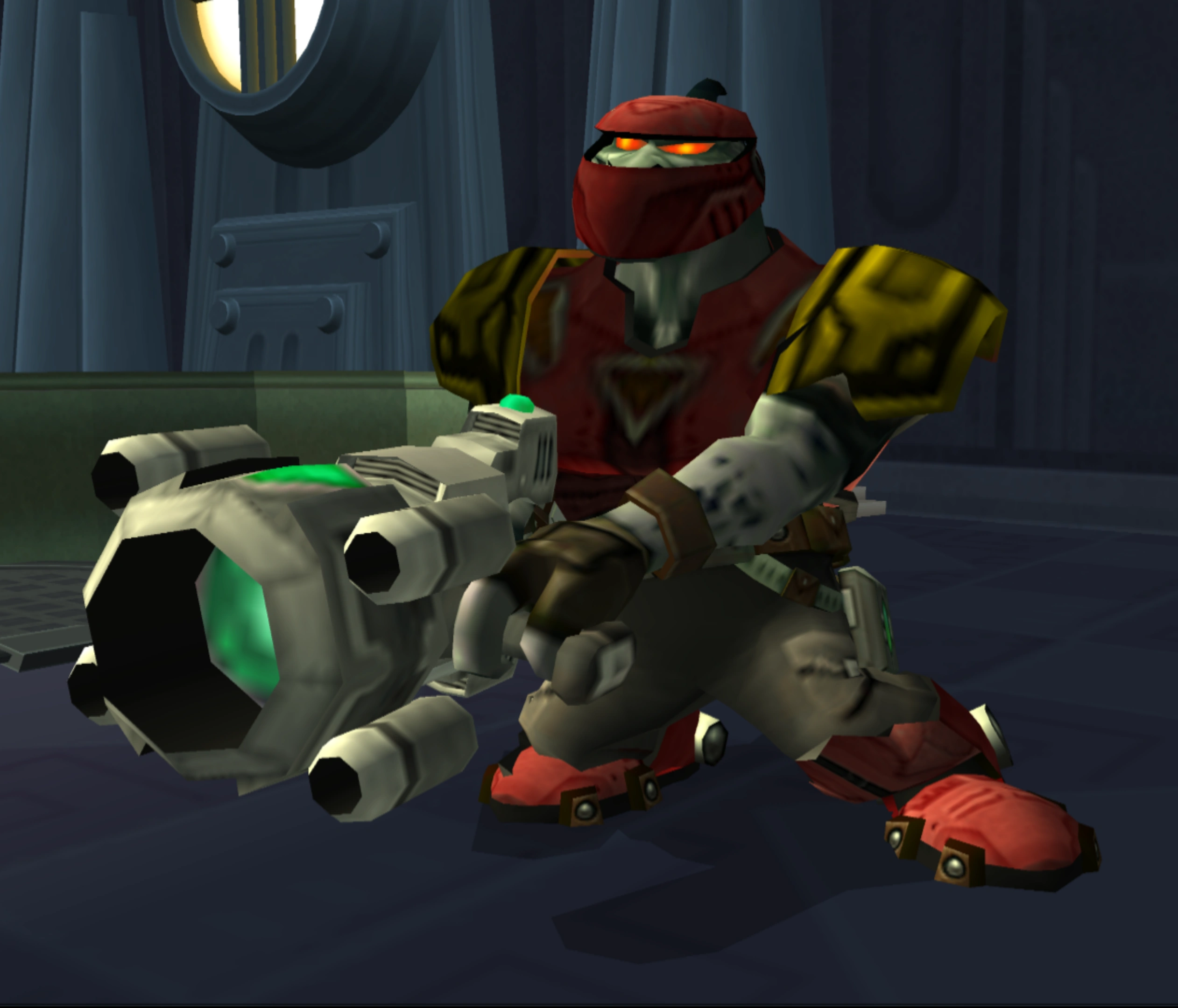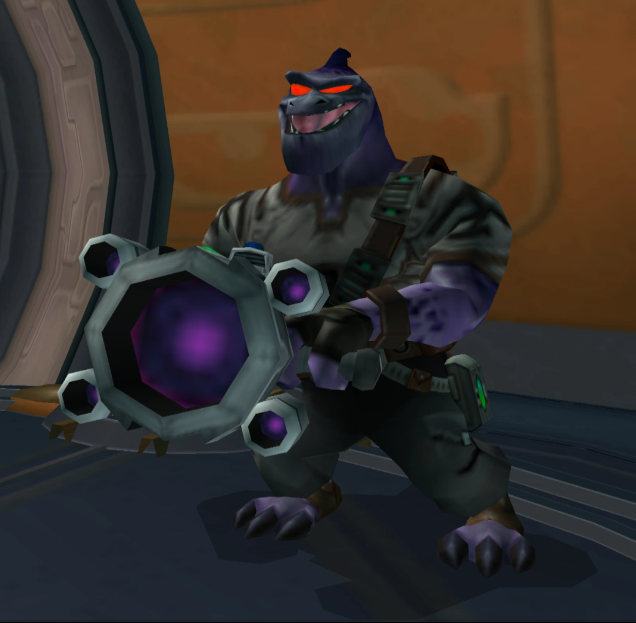They accompanied Angela Cross and came in force to the Maktar Resort, where the Thugs towed a moon-sized jamming array.[2] After Angela left, the Thugs remained behind to eliminate Ratchet. Ratchet encountered them during the mission "Win the Arena Battle". Ratchet later encountered the Thugs-4-Less Brute - Class II, the elite, standard issue Thug soldiers,[1] in Silver City, Boldan, during "Find Mr. Fizzwidget". He encountered them once again in the Thug HQ on planet Snivelak during "Rescue Angela".